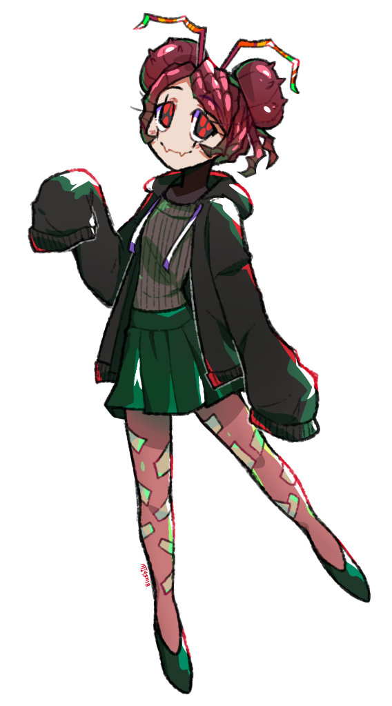 1girl antennae arthropod_girl artist_name black_jacket blushily brown_pantyhose closed_mouth commentary commission contemporary double_bun english_commentary entoma_vasilissa_zeta extra_pupils fangs full_body green_shoes green_skirt grey_sweater hair_bun hand_up hood hooded_jacket jacket light_blush long_sleeves overlord_(maruyama) pantyhose purple_hair red_eyes shoes short_hair simple_background skin_fangs skirt sleeves_past_wrists smile solo sweater white_background