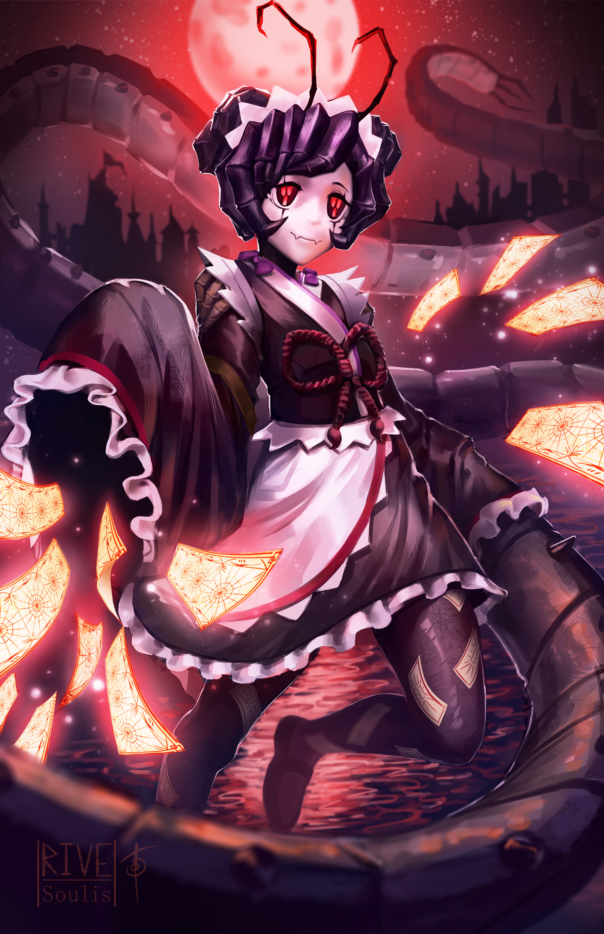 1girl absurdres antennae apron arthropod_girl artist_name black_pantyhose brown_kimono bug centipede closed_mouth commentary double_bun english_commentary entoma_vasilissa_zeta extra_pupils fangs full_moon glowing hair_bun highres japanese_clothes kimono light_smile long_sleeves maid maid_headdress mary_janes monster_girl moon night ofuda ofuda_on_clothes overlord_(maruyama) oversized_bug pantyhose purple_hair red_eyes red_moon rivesoulis shoes short_hair skin_fangs sky sleeves_past_wrists solo star_(sky) starry_sky white_apron