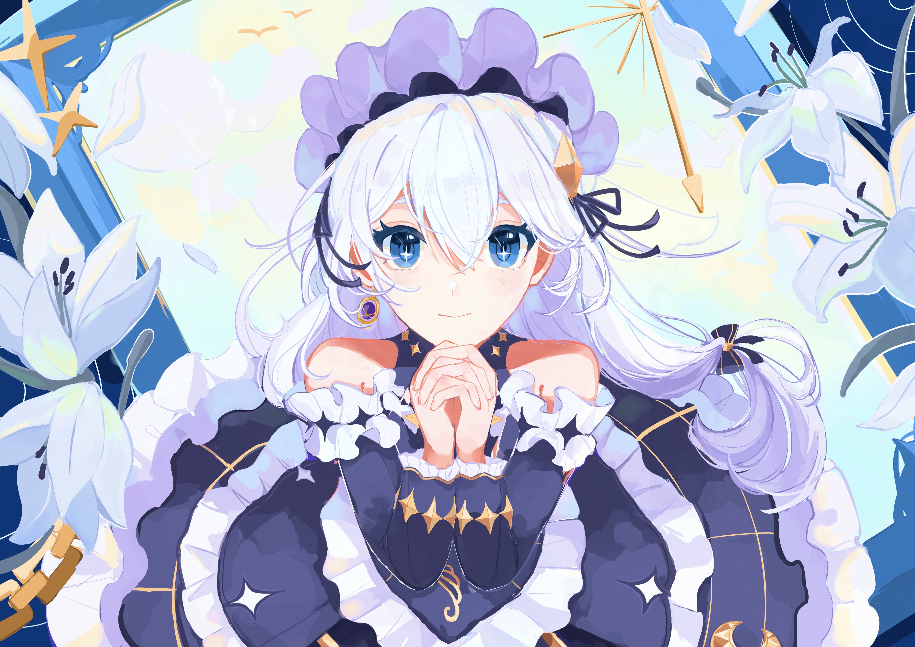 1girl 8sayo7_(8sayo7honkai) absurdres bare_shoulders black_dress black_sleeves blue_eyes closed_mouth commentary_request detached_sleeves dress eyebrows_hidden_by_hair flower frilled_dress frilled_sleeves frills hair_between_eyes highres honkai_(series) honkai_impact_3rd interlocked_fingers long_hair long_sleeves looking_at_viewer own_hands_clasped own_hands_together petals sleeveless sleeveless_dress smile solo theresa_apocalypse theresa_apocalypse_(empyrean_psalms) very_long_hair white_flower white_hair
