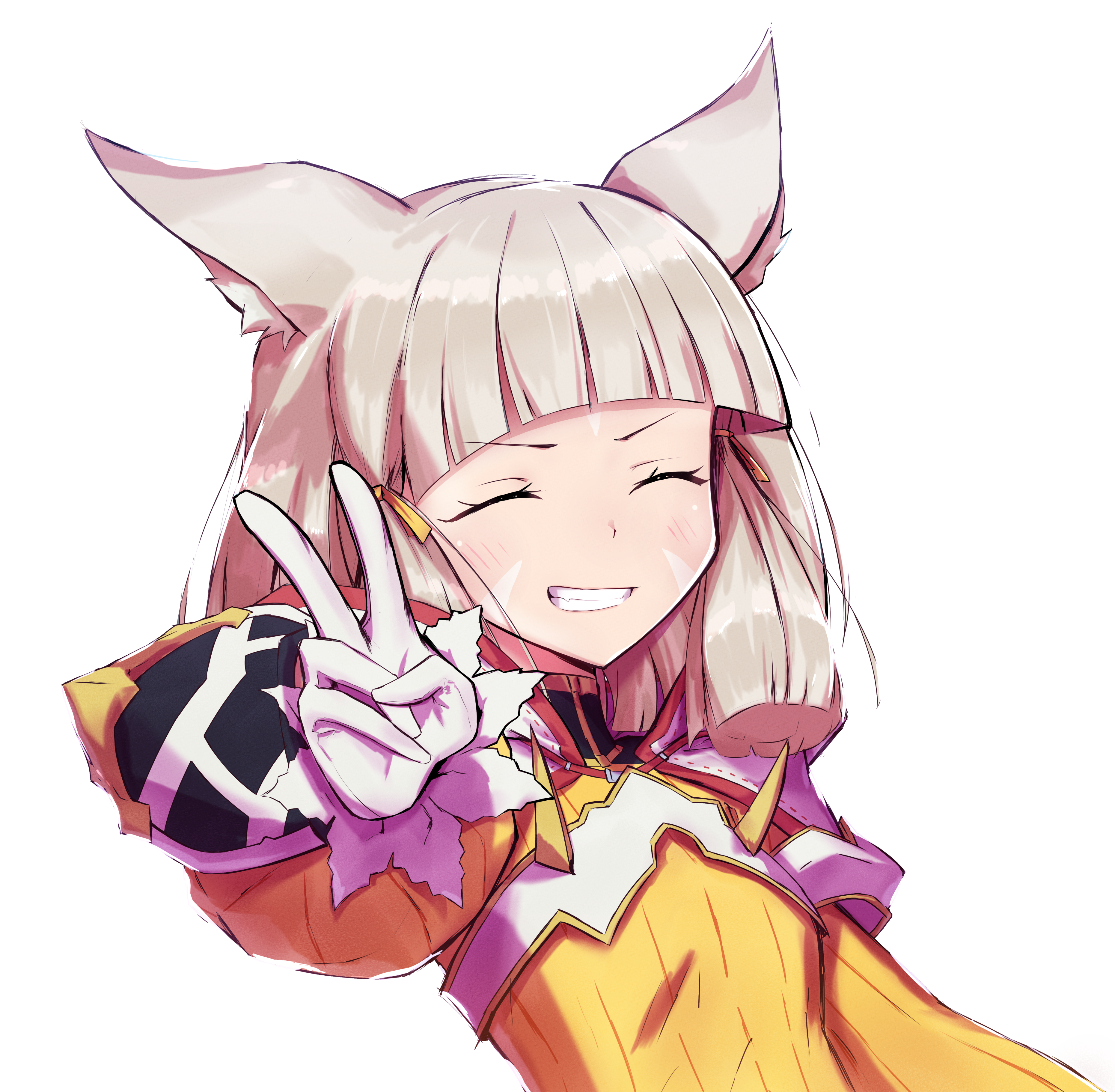 1girl :d absurdres animal_ears cat_ears cat_girl closed_eyes facing_viewer gloves grey_hair grin highres jumpsuit long_sleeves nia_(xenoblade) open_mouth outstretched_arm short_hair simple_background smile solo teeth tsukinaga upper_body v white_background white_gloves white_hood xenoblade_chronicles_(series) xenoblade_chronicles_2 yellow_jumpsuit