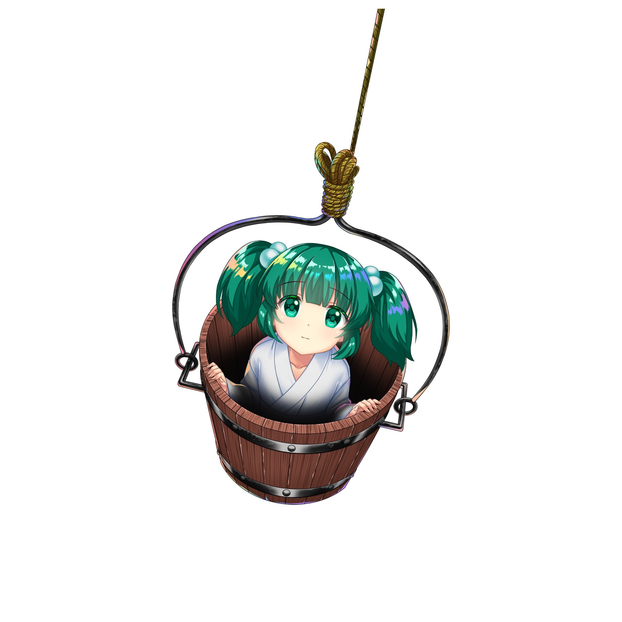 1girl bucket closed_mouth collarbone full_body game_cg green_eyes green_hair hair_bobbles hair_ornament highres in_bucket in_container japanese_clothes kimono kisume long_sleeves looking_at_viewer rotte_(1109) simple_background solo third-party_source touhou touhou_lostword two_side_up white_background white_kimono wooden_bucket