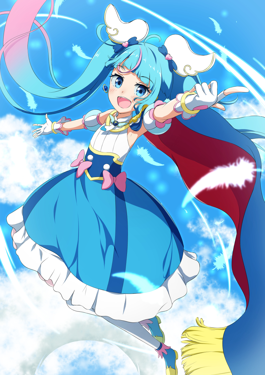 1girl :d ahoge arm_up bare_shoulders blue_cape blue_eyes blue_hair blue_shoes blue_skirt blue_sky cape cloud cure_sky day detached_sleeves diagonal_bangs feathers floating_hair frilled_skirt frills fringe_trim gradient_hair highres hirogaru_sky!_precure long_hair multicolored_hair open_mouth outdoors outstretched_arm pantyhose pink_hair precure puffy_short_sleeves puffy_sleeves red_cape shirt shoes short_sleeves skirt sky sleeveless sleeveless_shirt smile solo sora_harewataru streaked_hair tsuyukina_fuzuki twintails very_long_hair white_pantyhose white_shirt white_sleeves