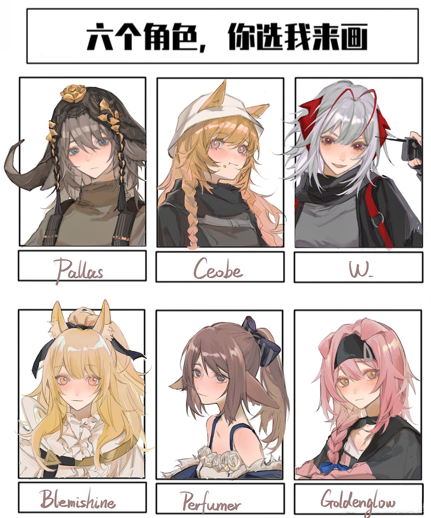 6+girls animal_ears antennae arknights black_bow black_choker black_hairband black_jacket blemishine_(arknights) blonde_hair blue_bow bow braid brown_eyes brown_hair cat_ears cat_girl ceobe_(arknights) ceobe_(unfettered)_(arknights) character_name choker controller cow_ears cow_girl cow_horns demon_girl demon_horns detonator dog_ears dog_girl dress ears_through_headwear floppy_ears flower flower_on_head food food_on_face fox_ears fox_girl fur-trimmed_jacket fur_trim grey_hair grey_shirt hair_bow hairband hat hatsumi0515 highres holding holding_controller holding_remote_control horns horse_ears horse_girl jacket long_hair multicolored_jacket multiple_drawing_challenge multiple_girls official_alternate_costume open_clothes open_jacket pallas_(arknights) pink_hair pink_jacket ponytail portrait red_eyes remote_control shirt short_hair side_braids sidelocks six_fanarts_challenge two-tone_jacket white_dress white_headwear yellow_flower