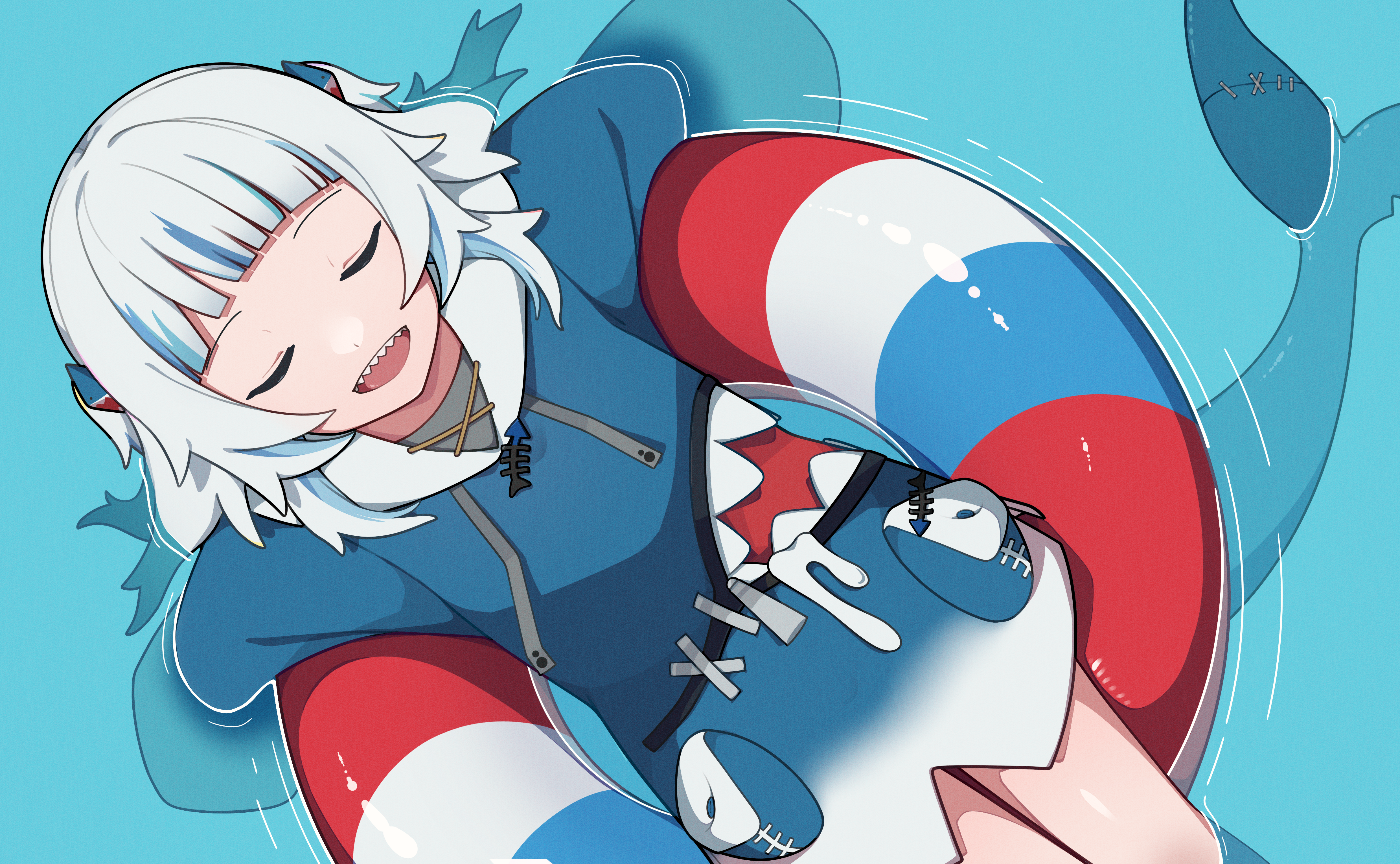 1girl absurdres afloat animal_hood bite_mark blue_background blue_hair blunt_bangs closed_eyes fins fish_tail gawr_gura gawr_gura_(1st_costume) hair_ornament highres hololive hololive_english hood hoodie innertube long_hair medium_hair multicolored_hair no_pants shark_girl shark_hair_ornament shark_hood shark_print shark_tail sharp_teeth sidelocks solo stitches streaked_hair swim_ring tail teeth two_side_up uziki_ntoki virtual_youtuber white_hair wide_sleeves