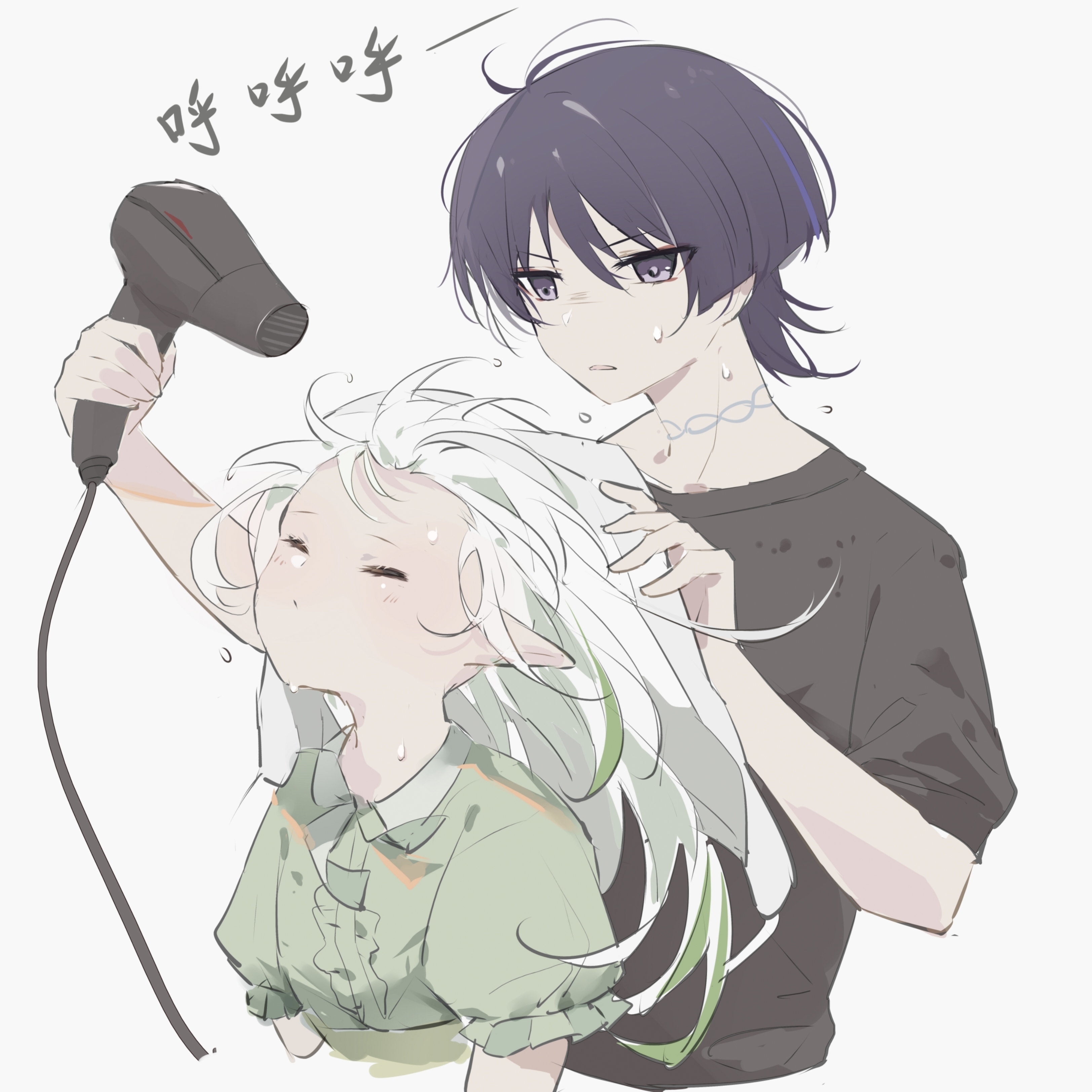 1boy 1girl absurdres alternate_costume black_shirt closed_eyes drying drying_another's_hair drying_hair genshin_impact hair_down hair_dryer highres holding holding_hair_dryer nahida_(genshin_impact) pointy_ears purple_eyes purple_hair scaramouche_(genshin_impact) shirt short_hair t-shirt wocalei2