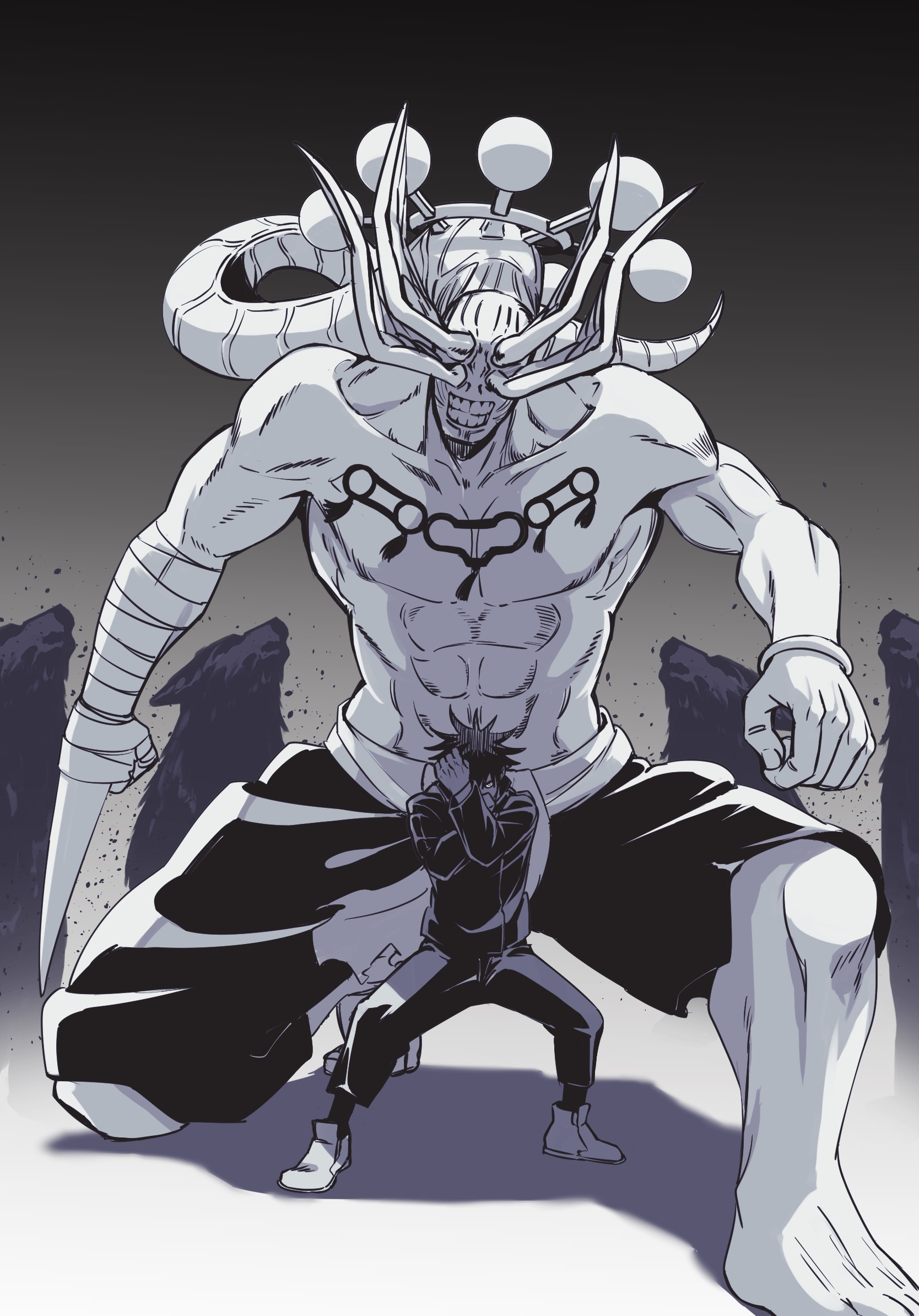 1boy 1other black_hair fknnn13 fushiguro_megumi gradient_background grin height_difference highres jujutsu_kaisen mahoraga_(jujutsu_kaisen) male_focus monster shikigami size_difference smile wheel_of_dharma wolf