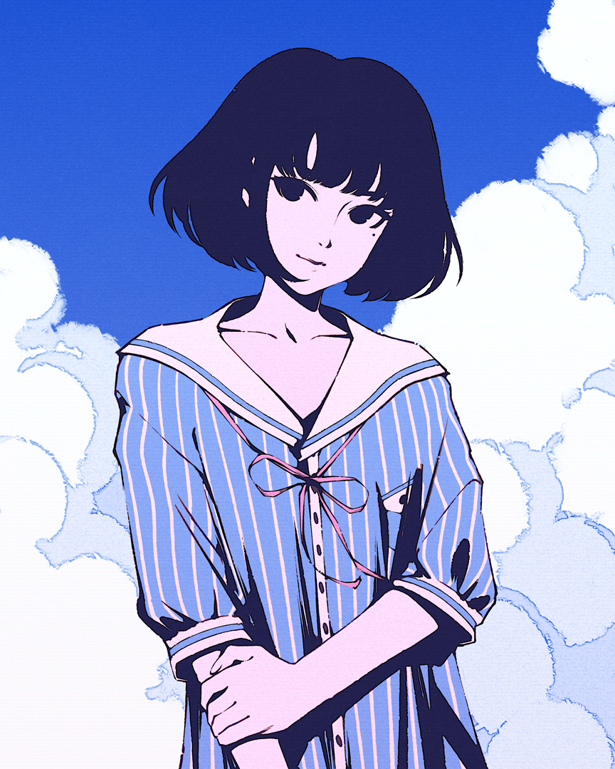 1girl akashi_(yojouhan) arm_at_side black_eyes black_hair blue_background blue_dress blue_sky blunt_bangs bob_cut breasts closed_mouth cloud cloudy_sky collarbone commentary cumulonimbus_cloud dress expressionless hand_on_own_arm head_tilt high_contrast looking_at_viewer mole mole_under_eye moshimoshibe neck_ribbon outdoors pink_ribbon ribbon romaji_commentary sailor_collar short_hair sky small_breasts solo striped_clothes striped_dress upper_body vertical-striped_clothes vertical-striped_dress white_sailor_collar yojouhan_shinwa_taikei
