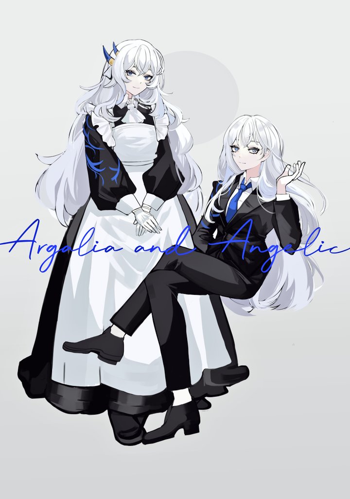 1boy 1girl aka_dang angelica_(project_moon) apron argalia_(project_moon) ascot black_dress black_footwear black_jacket blue_eyes blue_necktie brother_and_sister character_name closed_mouth crossed_legs dress gloves hand_up jacket library_of_ruina long_hair long_sleeves looking_at_viewer necktie project_moon puffy_long_sleeves puffy_sleeves shoes siblings sidelocks simple_background smile very_long_hair white_apron white_ascot white_background white_gloves white_hair