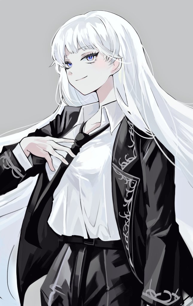 1girl aka_dang angelica_(project_moon) belt black_belt black_jacket black_necktie black_pants blue_eyes closed_mouth collared_shirt cowboy_shot grey_background hand_up jacket library_of_ruina long_hair long_sleeves looking_at_viewer necktie pants project_moon shirt silver_trim simple_background smile solo very_long_hair white_hair white_shirt wing_collar