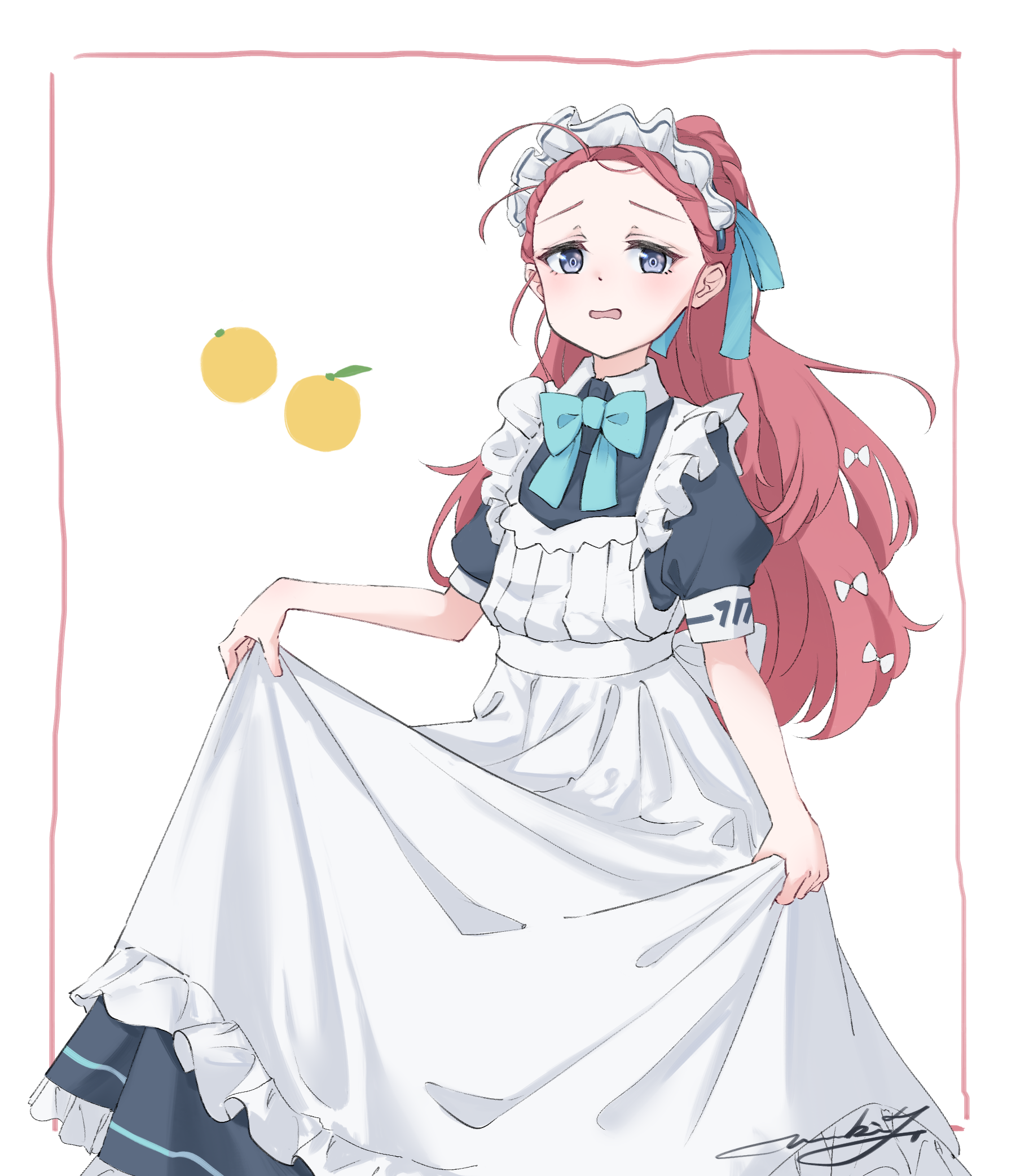 1girl alternate_costume apron bangs_pinned_back black_dress blue_archive blue_bow blue_bowtie blue_eyes blue_ribbon blush bow bowtie collared_shirt cowboy_shot cowlick dot_nose dress enmaided food forehead frilled_apron frilled_dress frills fruit fuyunoyuki hair_ribbon highres holding_own_dress long_dress long_hair maid maid_headdress open_mouth ponytail puffy_short_sleeves puffy_sleeves raised_eyebrows red_hair ribbon shirt short_sleeves signature simple_background solo white_apron white_background yuzu_(blue_archive) yuzu_(fruit) yuzu_(maid)_(blue_archive)