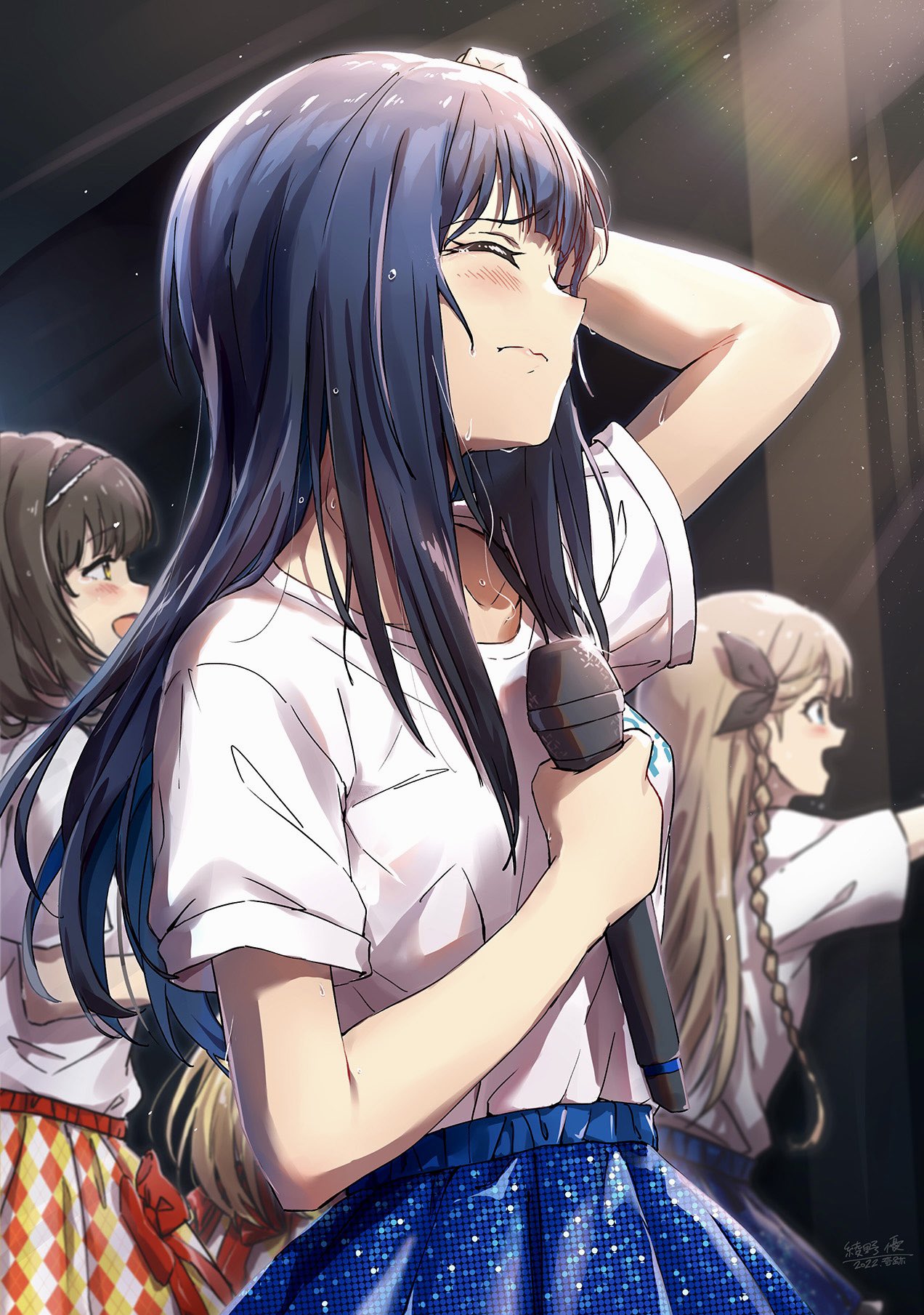 3girls ayano_yuu_(sonma_1426) black_bow black_hair black_hairband blonde_hair blue_eyes blue_skirt blush bow braid braided_sidelock brown_hair closed_eyes closed_mouth collarbone cowboy_shot dated facing_away from_side furrowed_brow glint hair_bow hairband hand_on_own_head high-waist_skirt highres holding holding_microphone idoly_pride indoors lens_flare light_rays long_bangs long_hair looking_ahead microphone multiple_girls nagase_kotono narumiya_suzu outstretched_arm saeki_haruko_(idoly_pride) shirt shirt_tucked_in short_sleeves sidelocks signature skirt sweat white_shirt