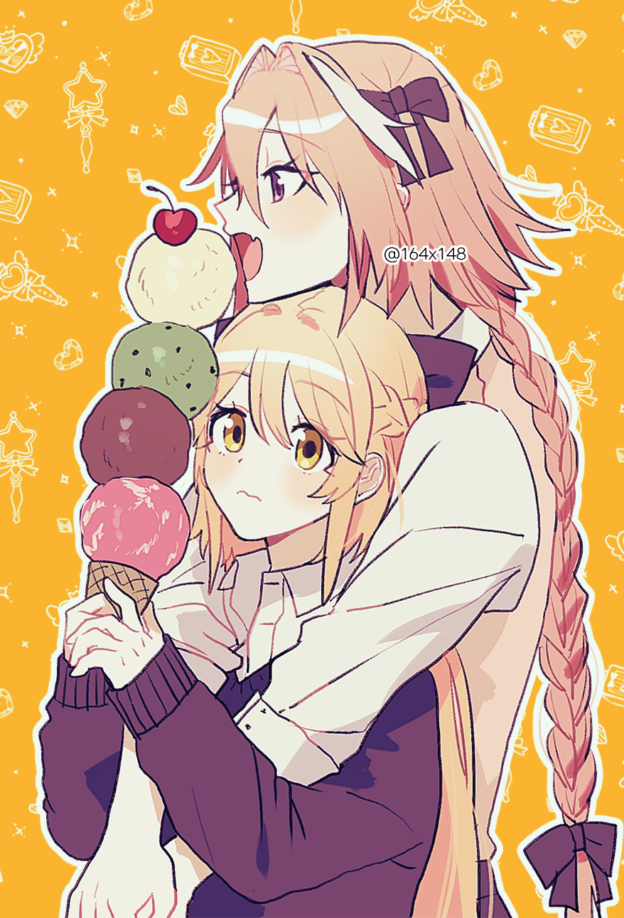 1boy 1girl astolfo_(fate) blonde_hair blush bow braid closed_mouth facing_to_the_side fate/grand_order fate_(series) food hair_bow hetero highres holding holding_food holding_ice_cream ice_cream ice_cream_cone koyashaka liss_meier_(koyashaka) oc_x_canon open_mouth original pink_hair purple_eyes trap twitter_username white_hair yellow_background yellow_eyes