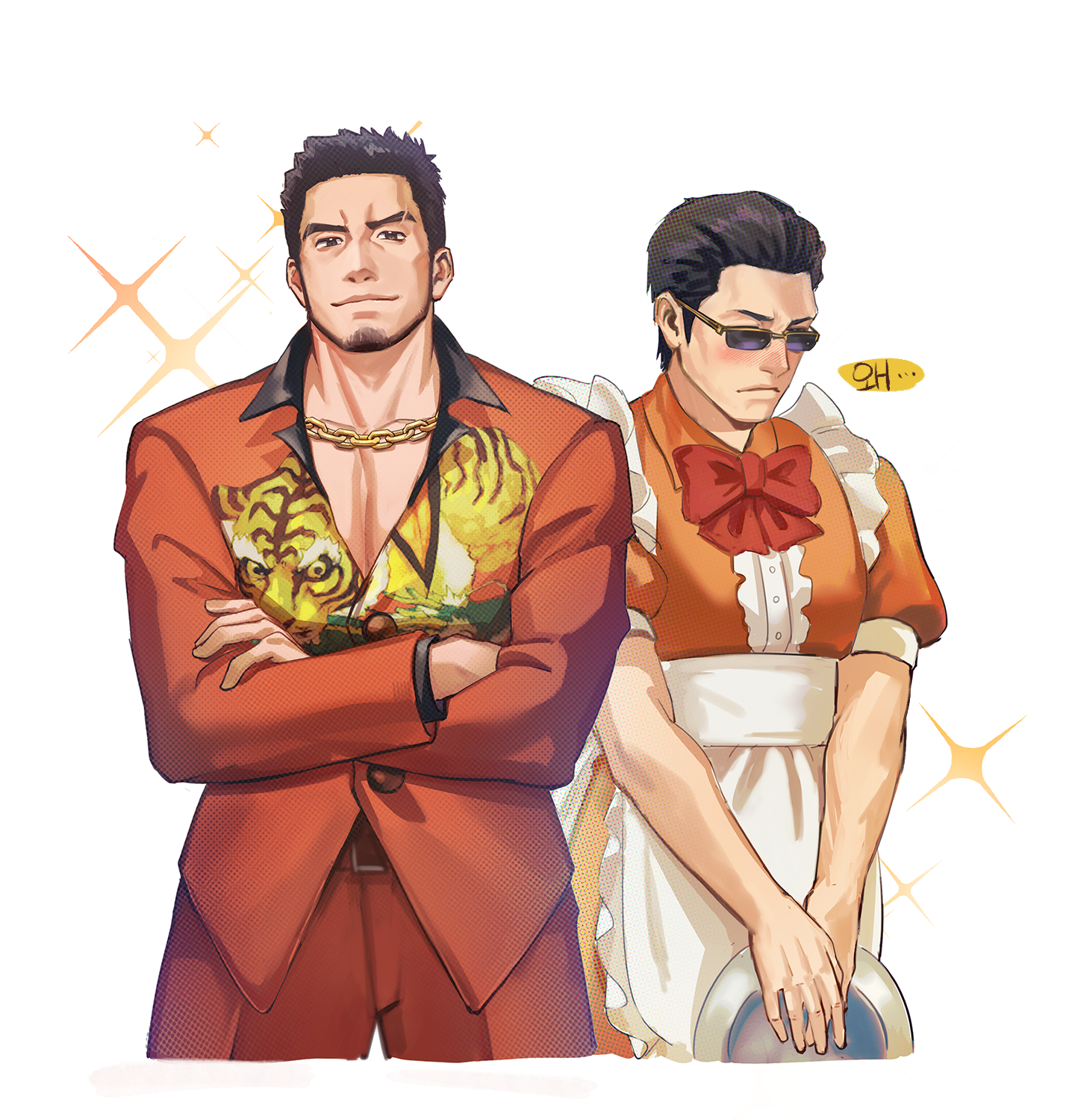 2boys ace_attorney alternate_costume animal_print averting_eyes bara beard blush chain chain_necklace cosplay cropped_legs crossdressing crossdressing_(mtf) crossed_arms enmaided eyebrow_cut facial_hair formal_clothes furio_tigre furio_tigre_(cosplay) higashi_tooru highres jacket jewelry judge_eyes kaito_masaharu large_pectorals long_sideburns looking_at_viewer maid male_focus male_maid mature_male multiple_boys muscular muscular_male necklace pectoral_cleavage pectorals phoenix_wright:_ace_attorney_-_trials_and_tribulations print_jacket red_suit ryuu_ga_gotoku_(series) sdz_(inazuma) short_hair shy sideburns smile sparkle sparkle_background suit sunglasses thick_eyebrows tiger_print translation_request