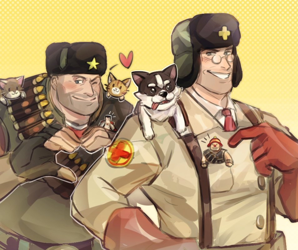 2boys alternate_body_type animal animal_on_shoulder bara cat cat_on_shoulder character_doll character_request dog_on_shoulder doll glasses gloves grin heart heart_hands heavy_(tf2) jacket looking_at_viewer male_focus mature_male medic_(tf2) military_jacket military_uniform mini_person miniboy multiple_boys muscular muscular_male red_gloves red_heavy_(tf2) red_medic_(tf2) round_eyewear sdz_(inazuma) shell_casing smile soldier_(tf2) suspenders team_fortress_2 thick_eyebrows upper_body