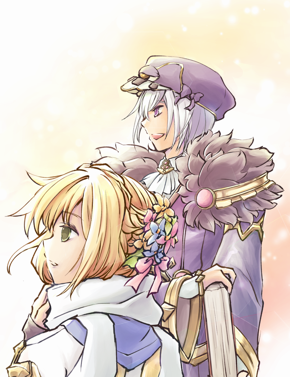 2boys ascot blonde_hair bow newsboy_cap cardinal_(ragnarok_online) coat commentary_request cross elemental_master_(ragnarok_online) eye_on_hat flower from_side fur_collar green_flower hair_bow hair_flower hair_ornament hat highres hikarei looking_afar male_focus multiple_boys open_mouth pink_bow pink_flower profile purple_coat purple_eyes purple_headwear ragnarok_online scarf short_hair smile upper_body white_ascot white_hair white_scarf yellow_bow yellow_eyes
