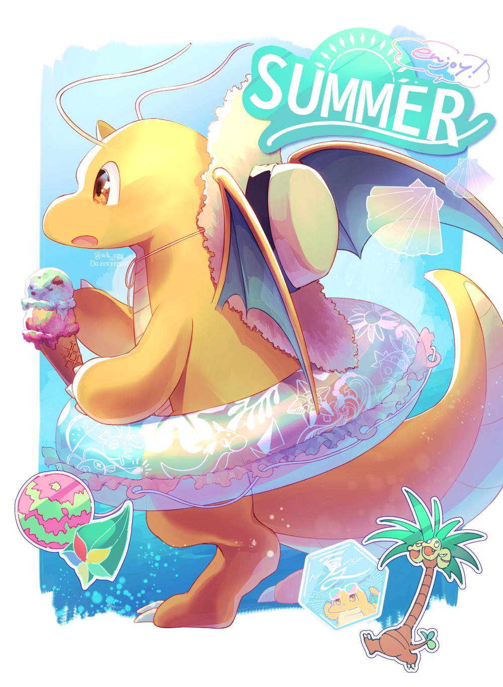 :o alolan_exeggutor alolan_form border brown_eyes claws commentary_request dragonite eko_(wk_egg) food from_side gen_1_pokemon gen_7_pokemon hat hat_on_back highres holding ice_cream ice_cream_cone innertube nintendo no_humans open_mouth pokemon pokemon_(creature) summer swim_ring white_border