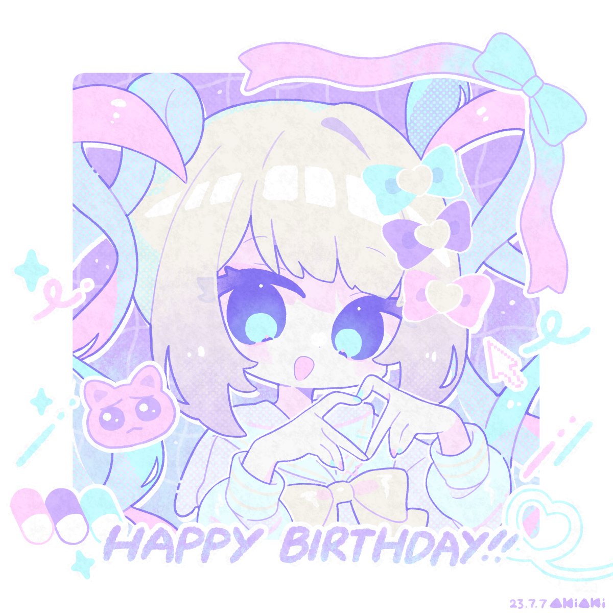 1girl :d akiaki_(aki70102) blonde_hair blue_bow blue_eyes blue_hair blue_nails blue_shirt bow chibi chouzetsusaikawa_tenshi-chan cursor dated emoji hair_bow hair_ornament happy_birthday heart heart_hair_ornament heart_hands highres long_hair long_sleeves looking_at_viewer multicolored_hair multicolored_nails needy_girl_overdose open_mouth pill pink_bow pink_hair pink_nails pleading_face_emoji purple_bow quad_tails sailor_collar shirt smile solo twintails upper_body yellow_bow yellow_nails