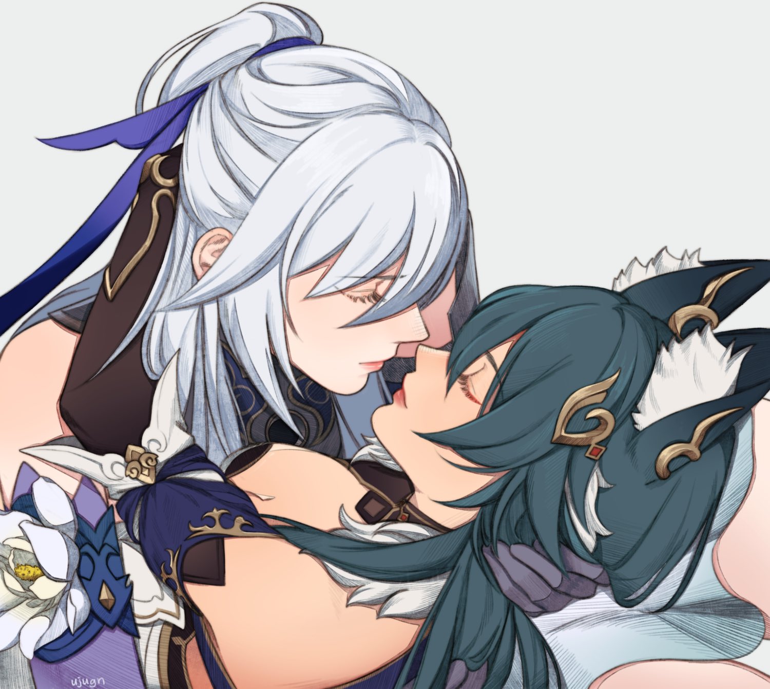 2girls animal_ear_fluff animal_ears chinese_clothes closed_eyes closed_mouth commentary english_commentary fox_ears fox_girl green_hair hand_on_another's_head high_ponytail highres honkai:_star_rail honkai_(series) imminent_kiss jingliu_(honkai:_star_rail) lying multiple_girls ponytail ujugn white_hair yukong_(honkai:_star_rail) yuri