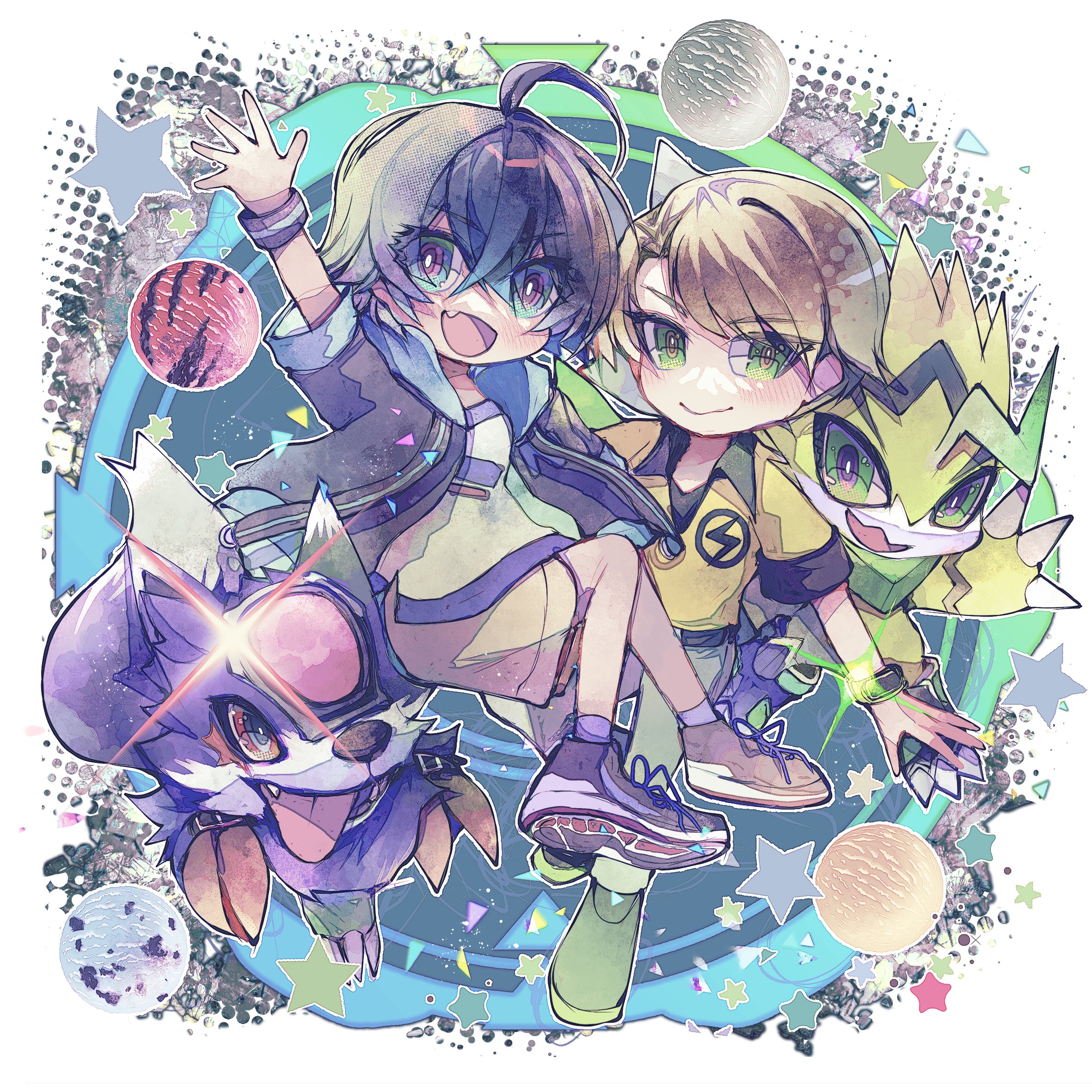 2boys 2others digimon digimon_(creature) digimon_seekers highres leon_alexander loogamon multiple_boys multiple_others nagasumi_eiji open_mouth pulsemon salute