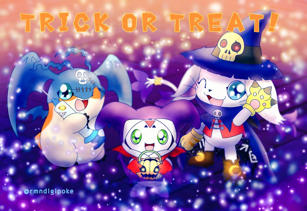 cosplay culumon digimon digimon_(creature) green_eyes halloween halloween_costume impmon impmon_(cosplay) looking_at_viewer one_eye_closed patamon picodevimon picodevimon_(cosplay) pumpmon skull smile tailmon wink wizarmon wizarmon_(cosplay)