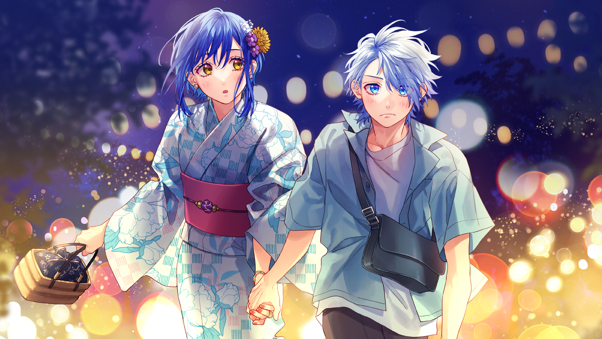 1boy 1girl ayase_koyuki backlighting bag blue_eyes blue_hair blurry blush bokeh brown_eyes depth_of_field flower furoshiki hair_flower hair_ornament handbag holding_hands honeyworks japanese_clothes kimono kokuhaku_jikkou_iinkai looking_ahead looking_at_another nail_polish night open_clothes open_shirt ougino_ryou outdoors parted_lips pink_nails print_kimono short_hair swept_bangs undershirt walking white_hair yamako_(state_of_children) yukata