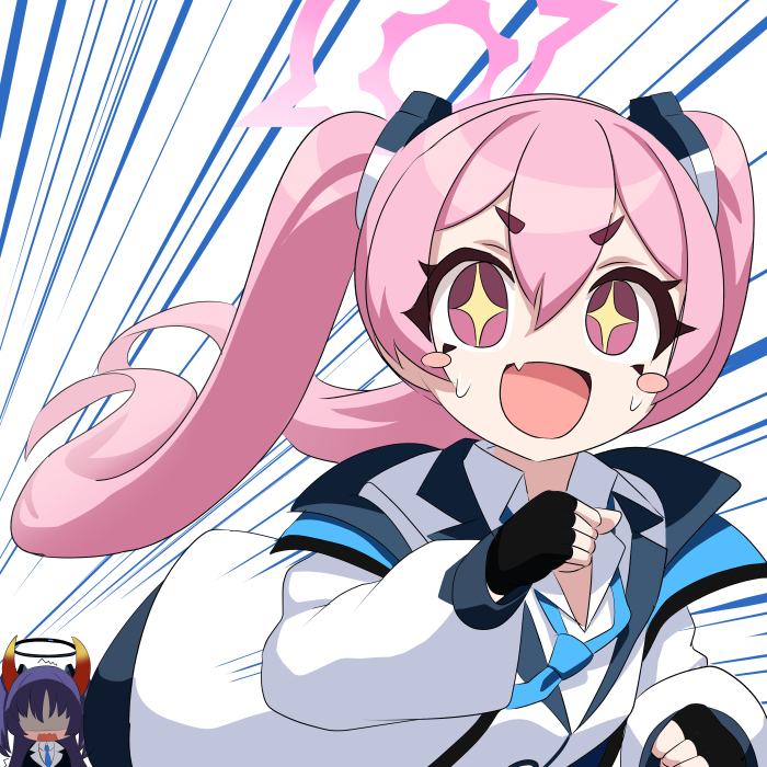 2girls :d angry black_gloves blazer blue_archive blue_necktie blush_stickers coat collared_shirt commentary_request demon_girl demon_horns fingerless_gloves fleeing gloves hair_between_eyes hair_ornament halo horns jacket koyuki_(blue_archive) long_hair long_sleeves looking_at_another looking_at_viewer multiple_girls necktie nervous_sweating open_clothes open_coat open_mouth parted_bangs pink_eyes pink_hair purple_hair running school_uniform shirt shooka sidelocks simple_background smile sweat symbol-shaped_pupils v-shaped_eyebrows white_background white_coat yuuka_(blue_archive)