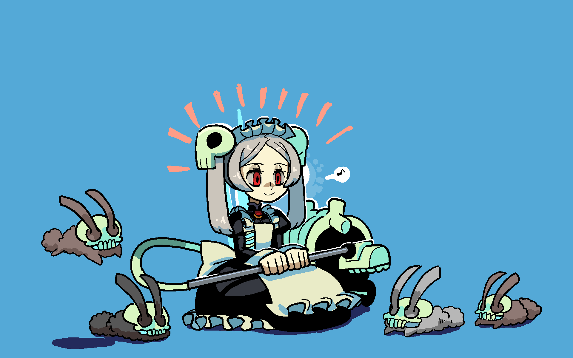 1girl apron black_dress bloody_marie_(skullgirls) blue_background closed_mouth dress dust_bunny_(skullgirls) grey_hair hair_ornament highres juliet_sleeves kuroirozuki long_sleeves maid maid_headdress notice_lines puffy_sleeves rabbit red_eyes simple_background sitting skull_hair_ornament skullgirls smile solo twintails vacuum_cleaner white_apron