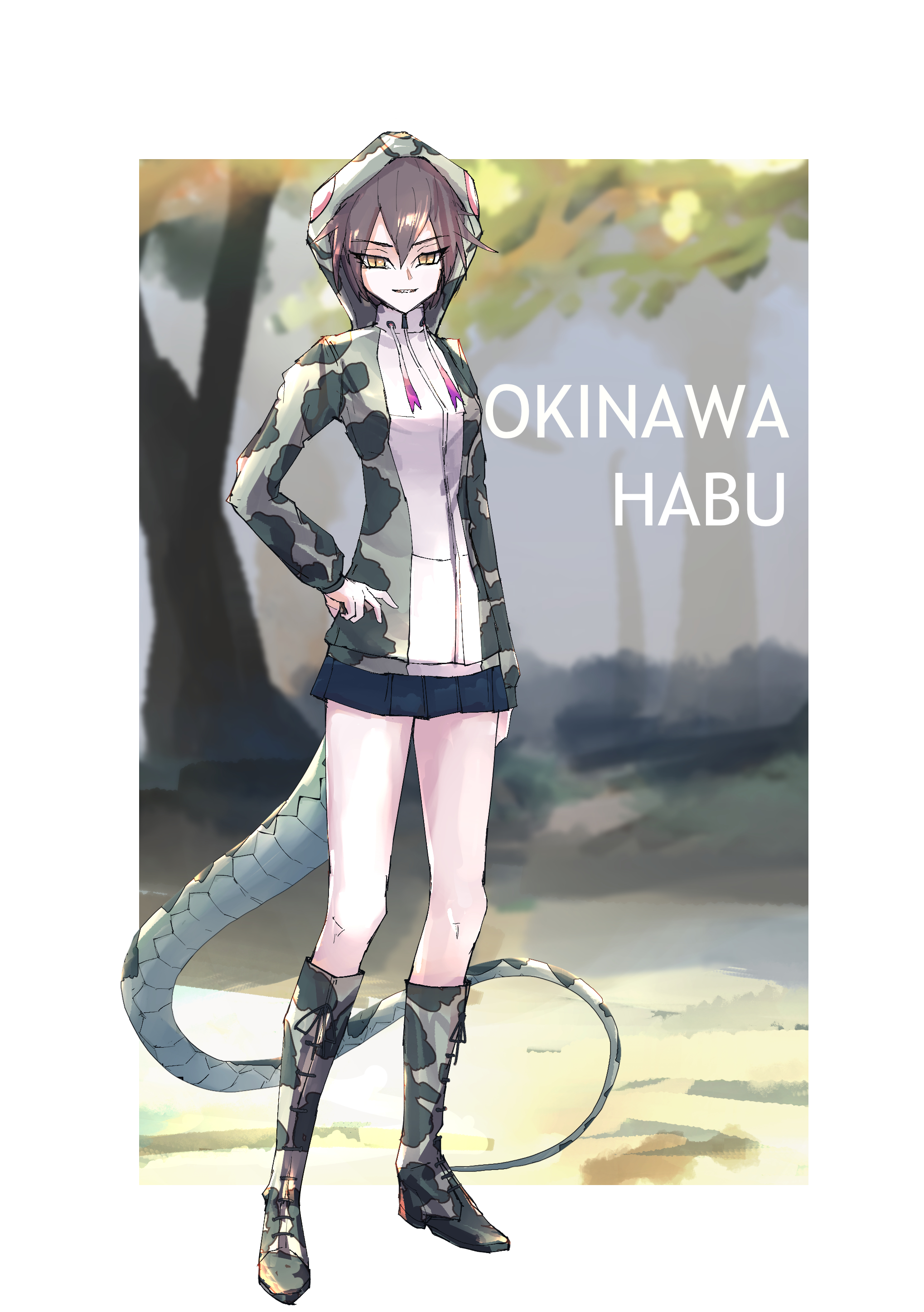 1girl absurdres animal_hood animal_print arm_at_side black_skirt blurry blurry_background boots border camouflage camouflage_footwear character_name collared_jacket day drawstring full_body grey_hair grin hair_between_eyes hand_on_own_hip highres hood hood_up hooded_jacket jacket kemono_friends lace-up_boots legs_apart long_sleeves looking_at_viewer microskirt multicolored_hair okinawa_habu_(kemono_friends) outdoors outside_border parted_bangs parted_lips pink_hair pleated_skirt print_hood print_jacket skirt slit_pupils smile snake_print snake_tail solo standing tail two-tone_hair white_border yappa_muri yellow_eyes zipper