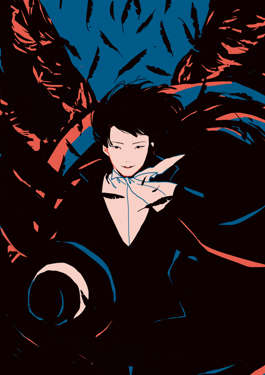 1boy ascot black_eyes black_hair black_wings blue_background canaco014 dress_shirt feathers flat_color floating_hair hat unworn_hat unworn_headwear high_collar limited_palette looking_at_viewer male_focus mugen_mamiya mugen_shinshi no_lineart shirt smile solo straight-on wind wings