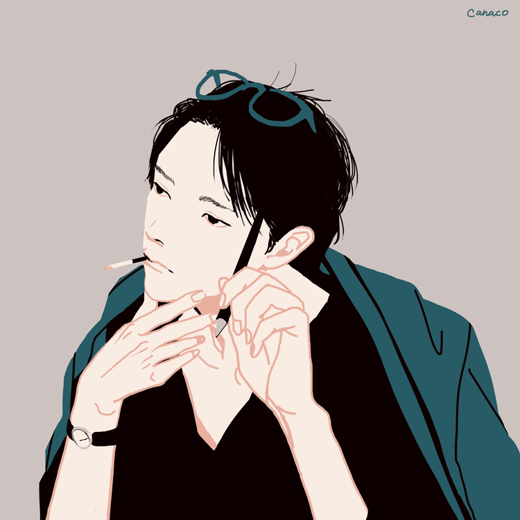 1boy black_eyes black_hair canaco014 cigarette eyewear_on_head flat_color glasses grey_background hand_on_own_chin hands_up holding holding_pen jacket jacket_on_shoulders limited_palette looking_to_the_side male_focus mouth_hold original pen short_hair solo watch wristwatch
