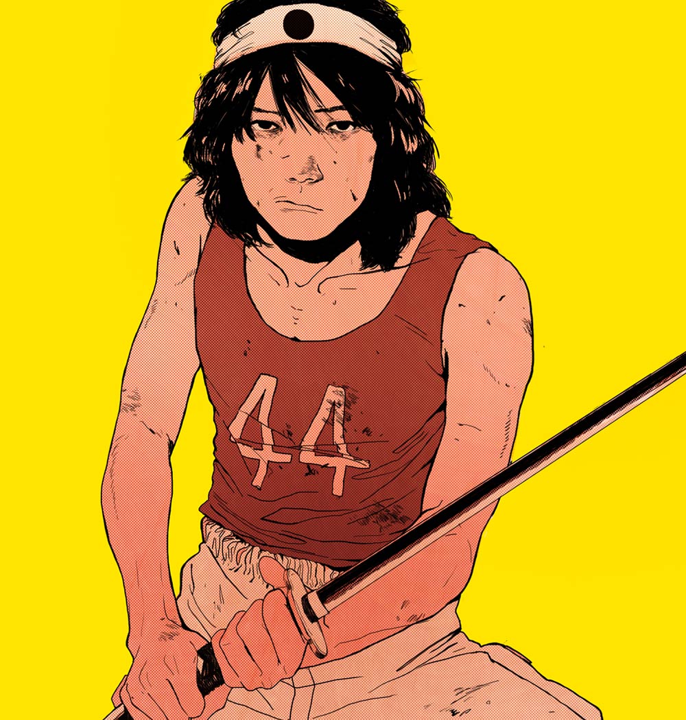 1boy black_eyes canaco014 collarbone fighting_stance flat_color hachimaki hair_between_eyes headband holding holding_sword holding_weapon katana limited_palette looking_at_viewer male_focus medium_hair messy_hair nose ootomo_katsuhiro_(style) original pants realistic screentones shirt_tucked_in solo sword tank_top weapon yellow_background