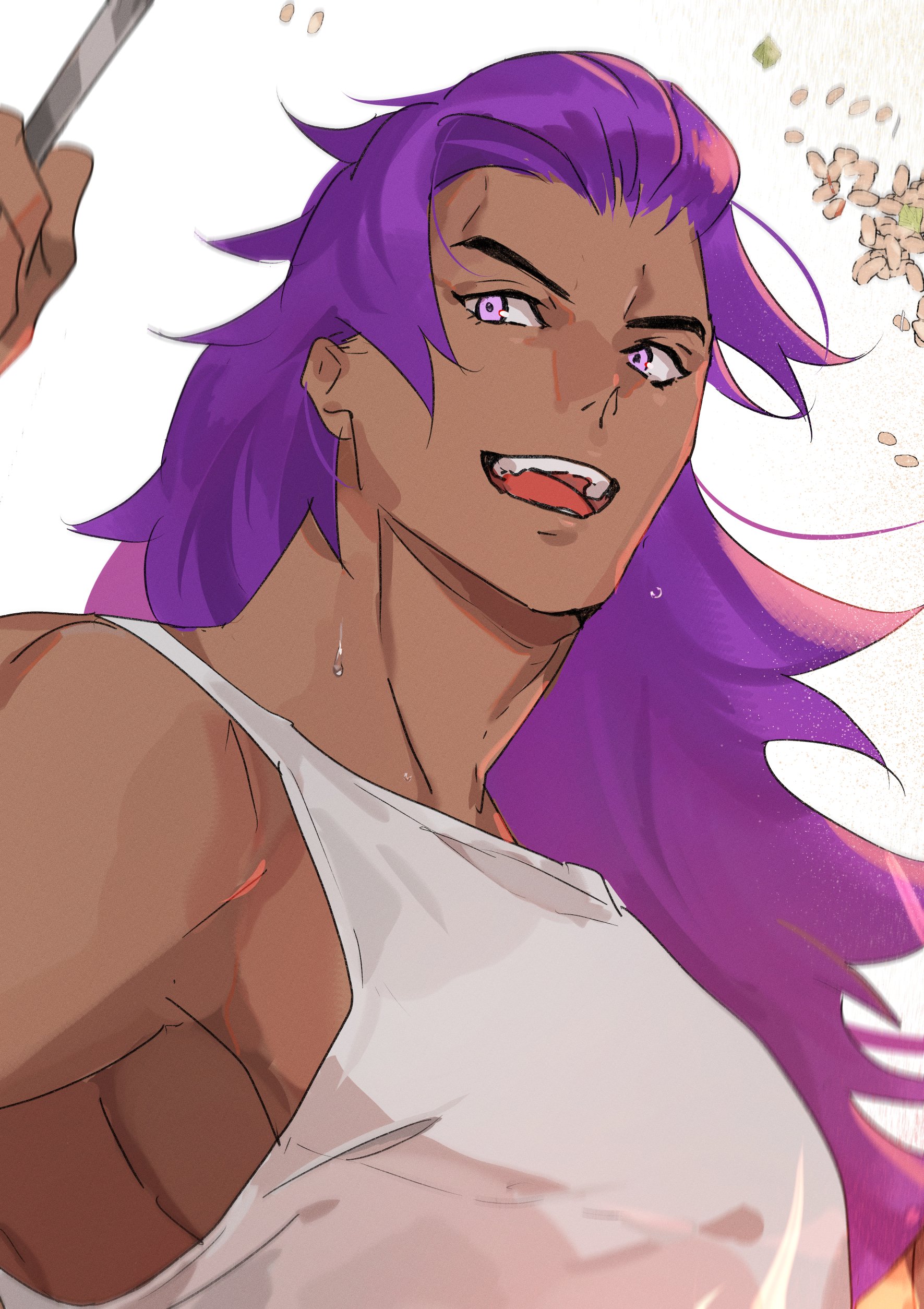 1boy absurdres alternate_costume bhima_(fate) dark-skinned_male dark_skin fate/grand_order fate_(series) hand_up highres koroponsu3 long_hair male_focus muscular muscular_male pectorals purple_eyes purple_hair sidepec smile solo sweat tank_top turning_head upper_body v-shaped_eyebrows white_background white_tank_top