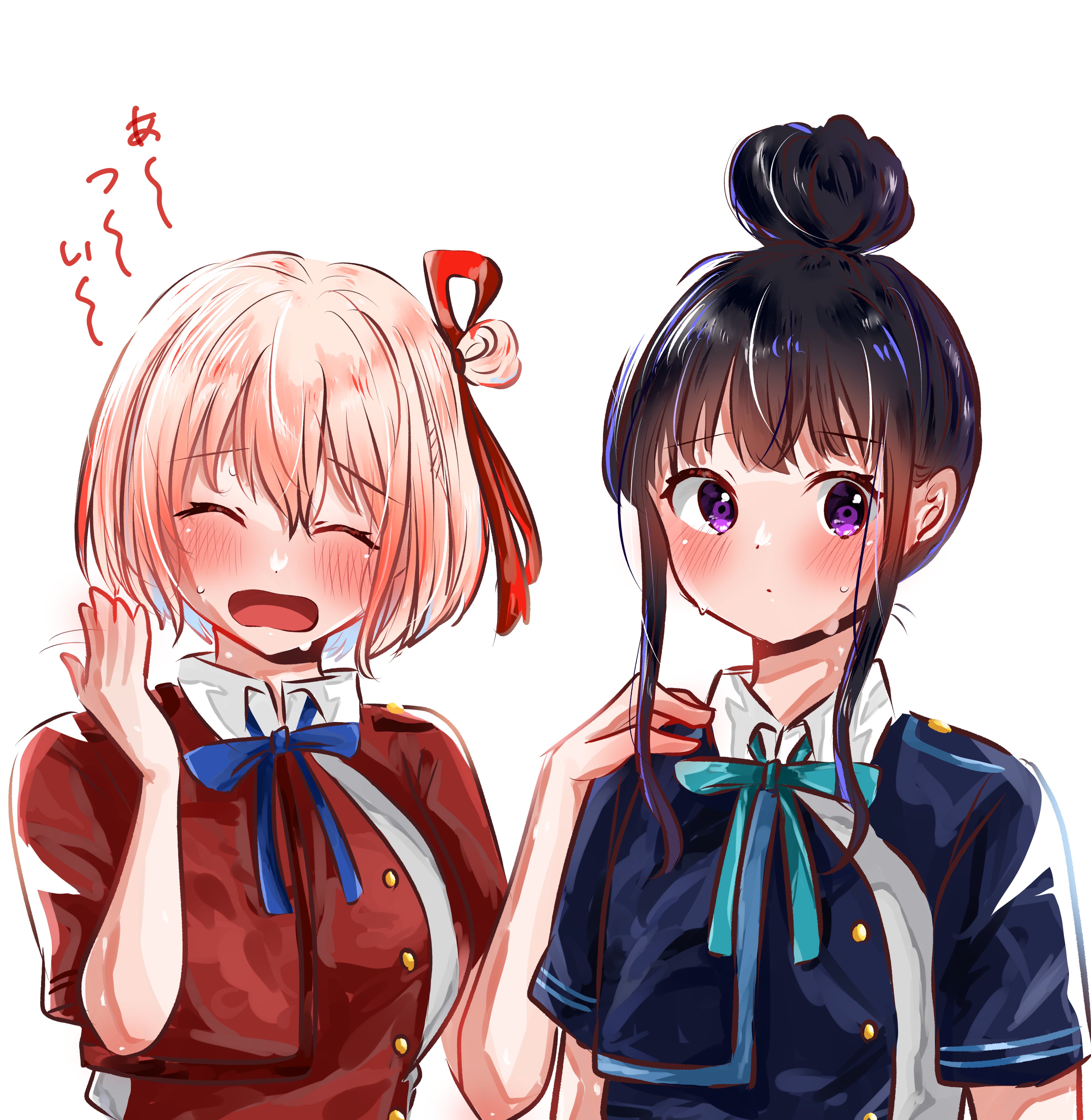 2girls :o absurdres alternate_hairstyle aqua_ribbon black_hair blonde_hair blue_dress blue_ribbon blush closed_eyes collared_shirt commentary_request dress grey_dress hair_bun hair_ribbon hand_on_another's_shoulder highres inoue_takina lycoris_recoil multiple_girls neck_ribbon nishikigi_chisato one_side_up open_mouth purple_eyes red_dress red_ribbon ribbon shirt short_hair short_sleeves sidelocks simple_background single_hair_bun sinkatutiya sweat translated two-tone_dress upper_body white_background white_shirt