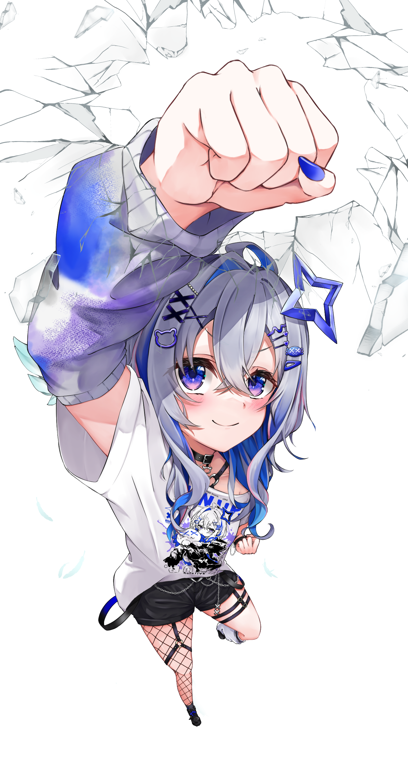 1girl absurdres amane_kanata amane_kanata_(cutesy_punk) blue_nails broken_glass character_print collar detached_sleeves fishnet_thighhighs fishnets foreshortening glass glass_shards hair_between_eyes hair_ornament hairclip highres hololive nail_polish official_alternate_costume print_shirt punching purple_eyes rike_111 self_character_print shirt short_hair_with_long_locks shorts single_fishnet_legwear smile solo t-shirt thigh_strap thighhighs uppercut virtual_youtuber