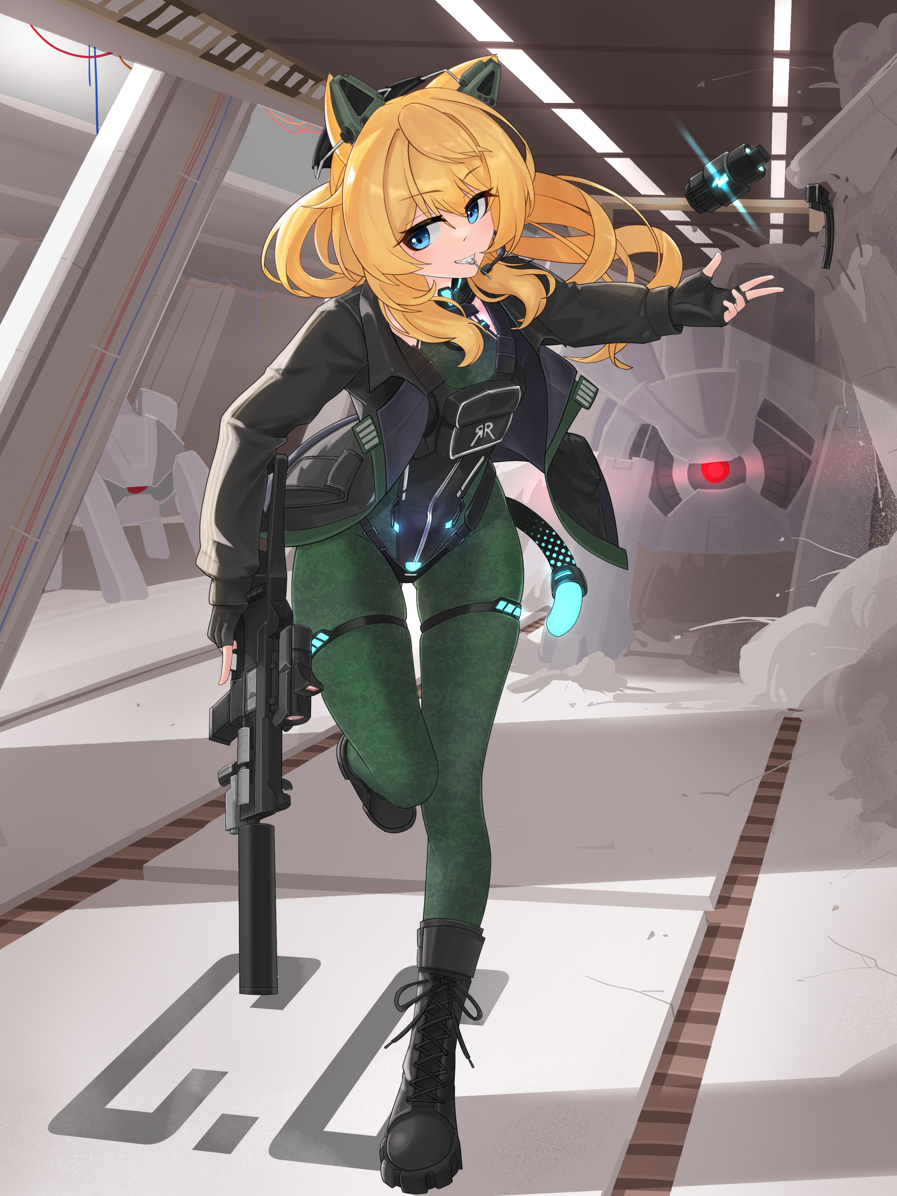 1girl absurdres animal_ears assault_rifle black_gloves blonde_hair blue_eyes bodysuit boots cat_ears cat_tail commission explosive fingerless_gloves gloves grenade grin gun highres holding holding_gun holding_weapon long_hair nabiyan original rifle robot smile solo tail weapon
