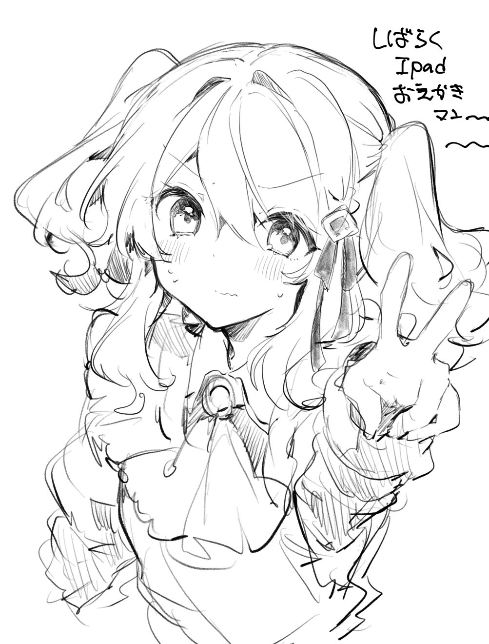 1girl ascot blush collared_shirt greyscale hair_between_eyes hand_up highres ikeuchi_tanuma long_sleeves looking_at_viewer monochrome original outstretched_arm shirt short_hair short_twintails sidelocks sketch solo sweatdrop tino_(ikeuchi_tanuma) twintails upper_body v v-shaped_eyebrows