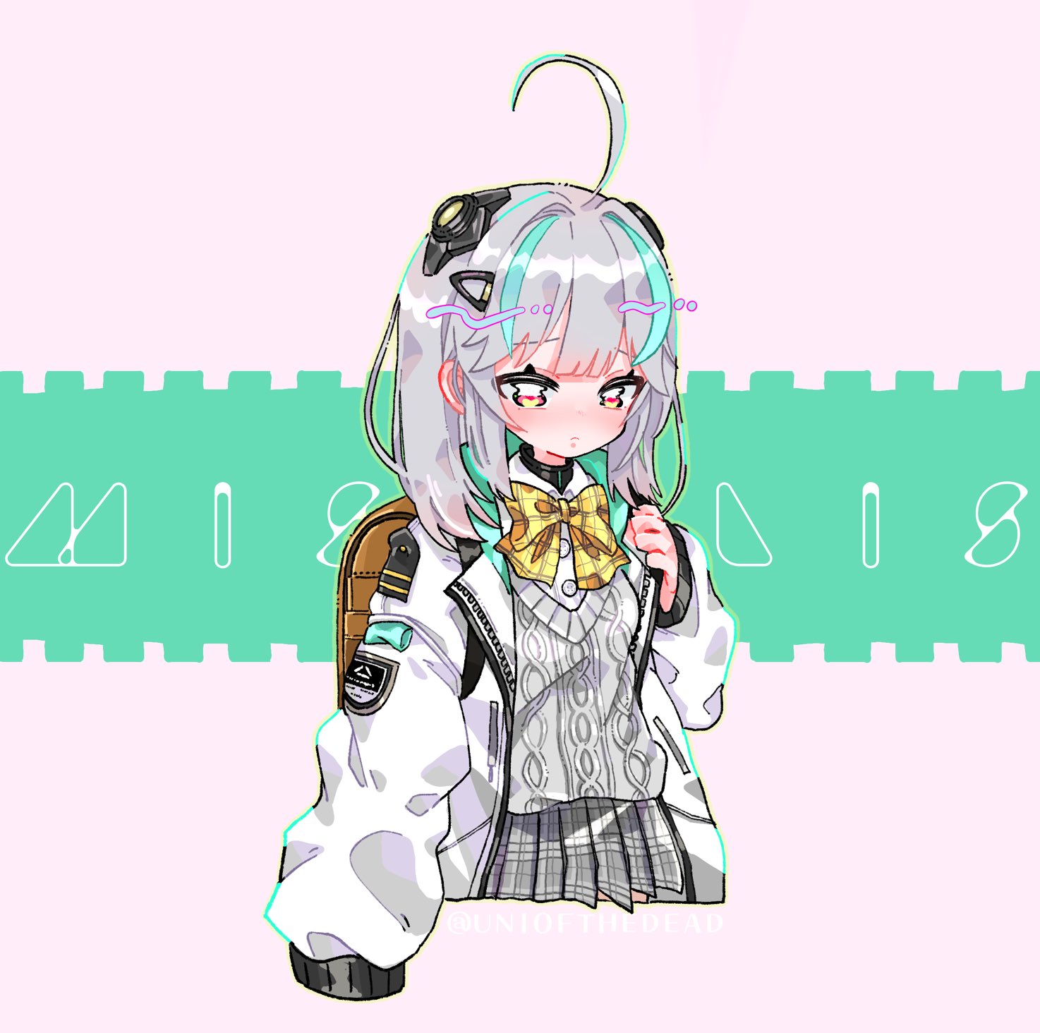 1girl admi_(nikke) ahoge backpack bag blush bow breasts collared_shirt cropped_torso frown goddess_of_victory:_nikke green_hair grey_hair grey_skirt grey_sweater hair_intakes hair_ornament hairclip highres jacket long_sleeves medium_hair miniskirt multicolored_hair open_clothes open_jacket pleated_skirt puffy_sleeves randoseru shirt sidelocks skirt small_breasts solo streaked_hair sweater uniofthedead white_jacket white_shirt yellow_bow