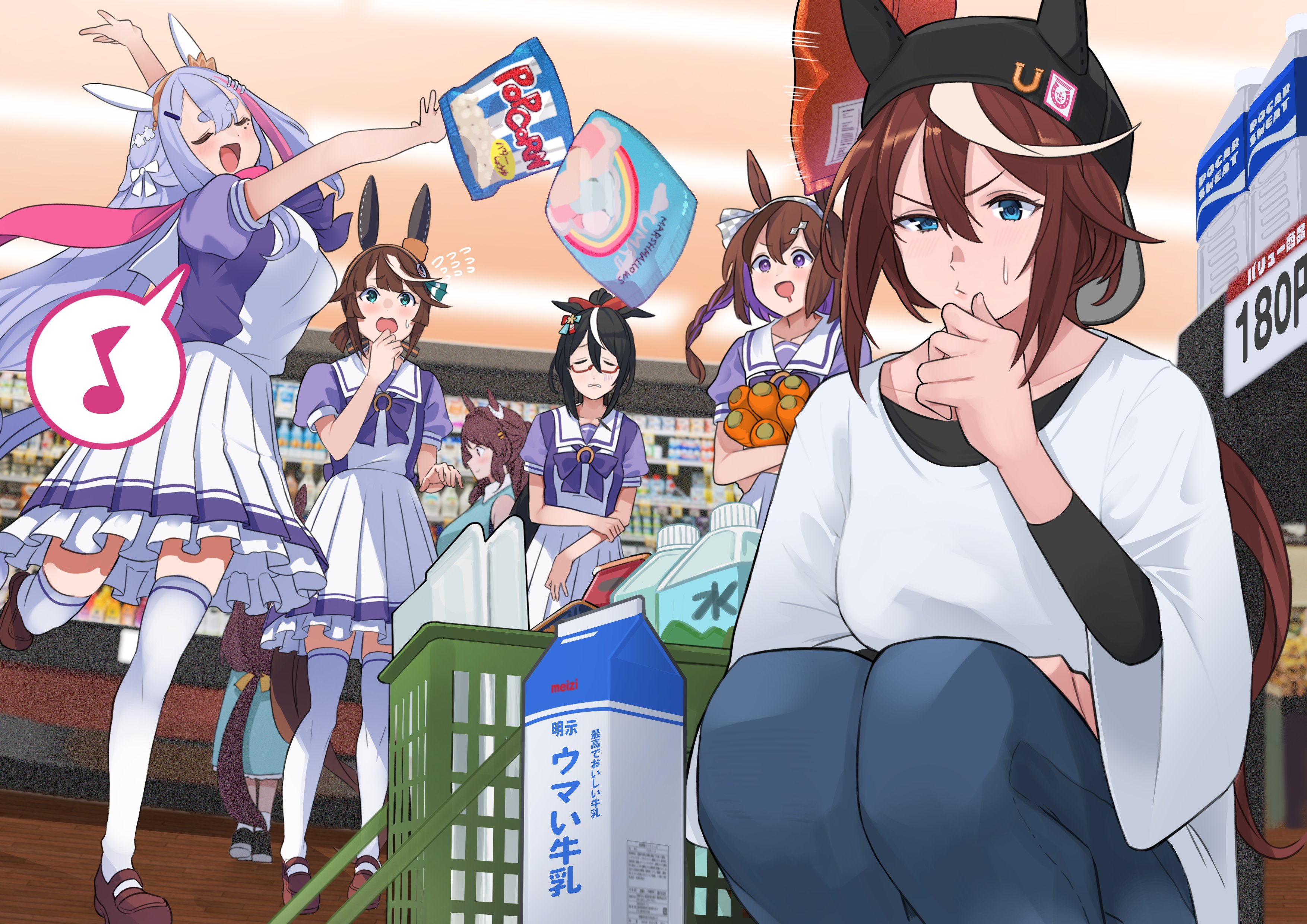 6+girls absurdres aged_up animal_ears beanie black_headwear black_shirt blue_eyes blue_pants blush bow bowtie braid brand_name_imitation brown_footwear brown_hair carrot child closed_eyes colored_inner_hair do_deuce_(racehorse) drink_carton drooling ear_covers equinox_(racehorse) genderswap genderswap_(mtf) green_eyes hair_between_eyes hair_ornament hair_ribbon hairband hairclip hat highres holding holding_carrot horse_ears horse_girl horseshoe_ornament leg_up light_hello_(umamusume) loafers long_hair meikei_yell_(racehorse) milk_carton mother_and_child mother_and_daughter mouth_drool multicolored_hair multiple_girls musical_note original pants parent_and_child personification plastic_bottle pleated_skirt pocari_sweat ponytail puffy_short_sleeves puffy_sleeves purple_bow purple_bowtie purple_eyes purple_hair purple_serafuku purple_shirt red-framed_eyewear red_ribbon ribbon sailor_collar sailor_shirt school_uniform semi-rimless_eyewear serafuku shirt shoes short_sleeves skirt sodashi_(racehorse) spoken_musical_note squatting streaked_hair thick_eyebrows thighhighs tokai_teio_(umamusume) tracen_school_uniform two-tone_hair umamusume white_hair white_shirt white_skirt white_thighhighs yokoji_(kodai2015)