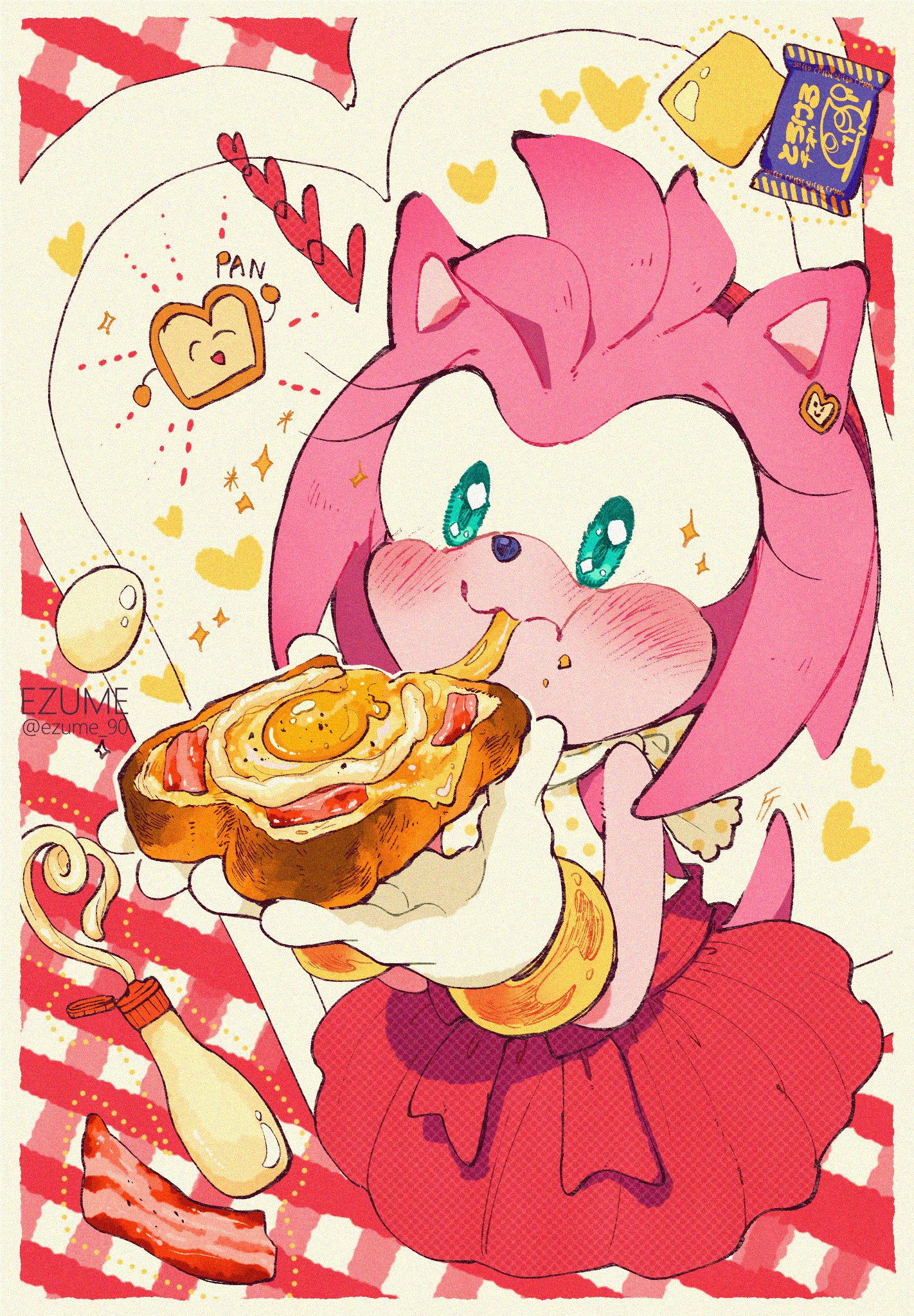 1girl amy_rose animal_ears animal_nose aqua_eyes artist_name bacon bare_shoulders blush border bottle bow bracelet bread bread_slice cheese closed_mouth eating egg eyelashes ezume_(rosehip) food food_on_face fried_egg fried_egg_on_toast furry furry_female gloves gold_bracelet hairband hands_up heart hedgehog_girl highres holding holding_food jewelry looking_to_the_side mayonnaise package pink_fur plaid_background polka_dot red_background red_bow red_hairband red_skirt short_tail skirt solo sonic_(series) standing star_(symbol) tail tank_top toast white_background white_border white_gloves white_tank_top