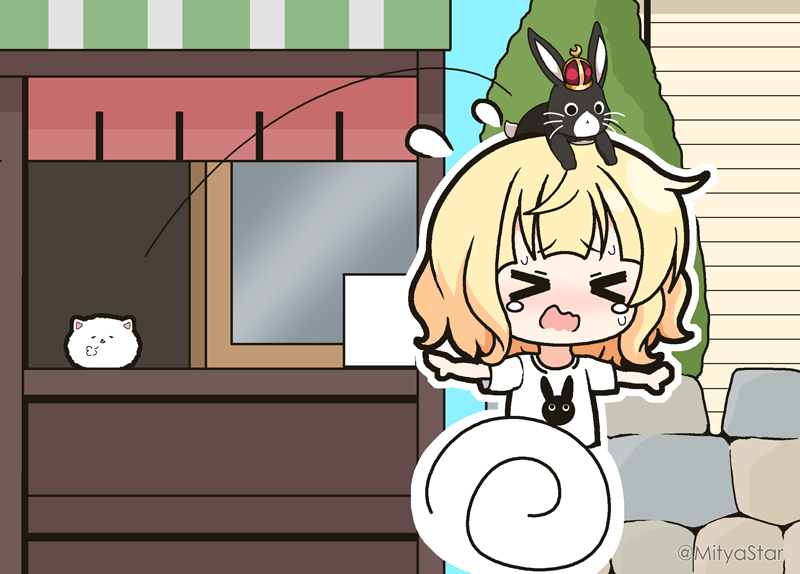 >_< 1girl angora_rabbit animal animal_on_head anko_(gochiusa) blonde_hair blue_sky blush character_print chibi closed_eyes commentary_request crescent crown day gochuumon_wa_usagi_desu_ka? kirima_syaro mini_crown mitya motion_lines nose_blush on_head open_mouth outdoors outline outstretched_arms print_shirt rabbit shirt sky speed_lines spread_arms sweat tears tippy_(gochiusa) twitter_username wavy_mouth wheel_o_feet white_outline white_shirt