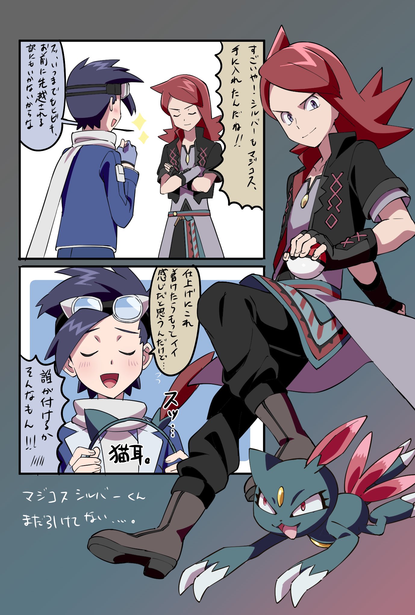 2boys animal_ears black_hair blush boots claws closed_eyes comic crossed_arms edamame_(buruburu) ethan_(pokemon) ethan_(sygna_suit)_(pokemon) fake_animal_ears fingerless_gloves gen_2_pokemon gloves goggles goggles_on_head hairband highres holding holding_poke_ball male_focus multiple_boys nintendo official_alternate_costume open_mouth poke_ball poke_ball_(basic) pokemon pokemon_(creature) pokemon_masters_ex red_eyes red_hair scarf silver_(pokemon) silver_(sygna_suit)_(pokemon) smile sneasel sparkle translation_request white_scarf