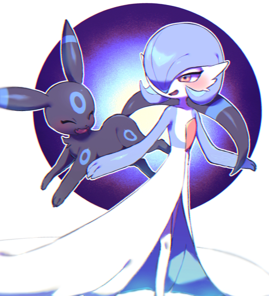 1girl ^_^ alternate_color blue_skin blurry blush bob_cut chromatic_aberration closed_eyes colored_skin depth_of_field facial_mark facing_another fang female_focus flat_chest forehead_mark gardevoir gen_2_pokemon gen_3_pokemon green_hair hair_over_one_eye half-closed_eyes happy jumping looking_at_another looking_to_the_side multicolored_skin nintendo one_eye_covered open_mouth outline pokemon pokemon_(creature) red_eyes s_(esumi_kihomaru) shiny_pokemon short_hair skin_fang smile standing two-tone_skin umbreon white_outline white_skin