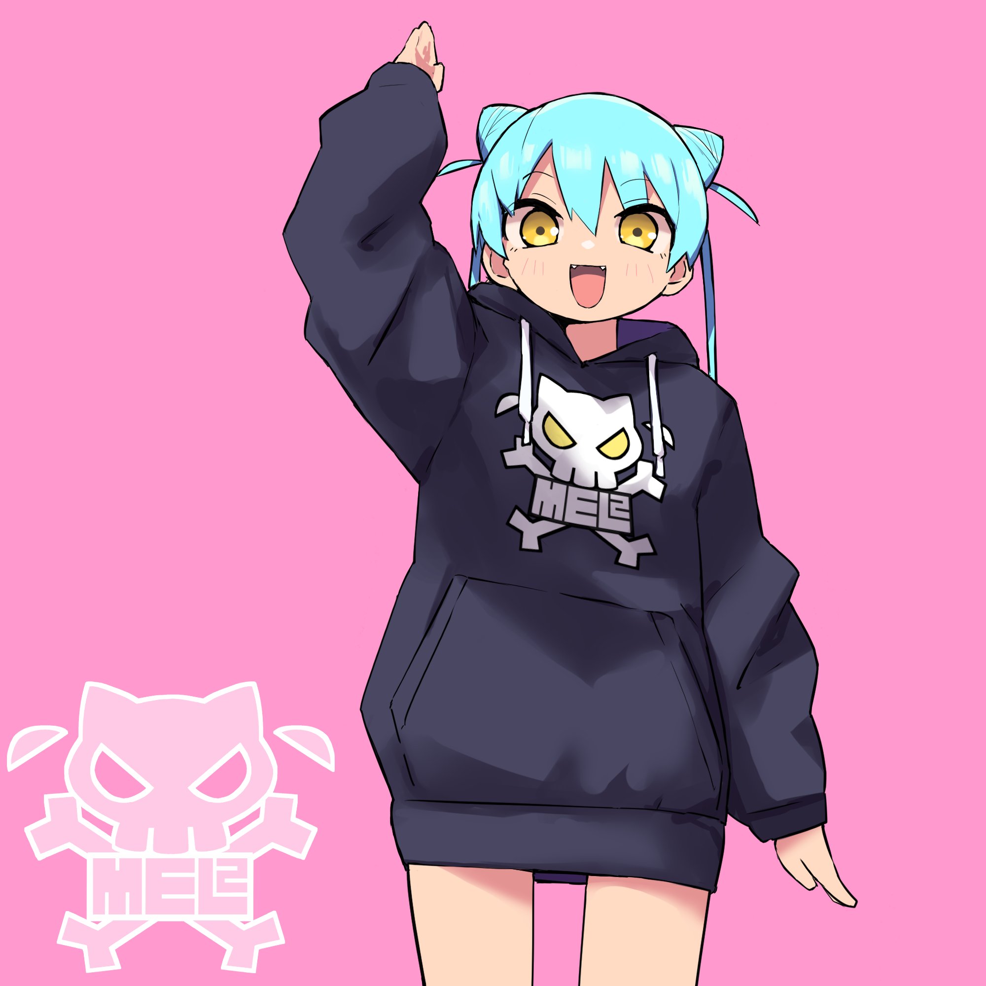 1girl aqua_hair arm_up black_hoodie blush double_bun fangs hair_between_eyes hair_bun highres hood hoodie long_hair long_sleeves looking_at_viewer open_mouth pink_background shinigami_dot_com simple_background sleeves_past_wrists solo twintails yachima_tana yellow_eyes