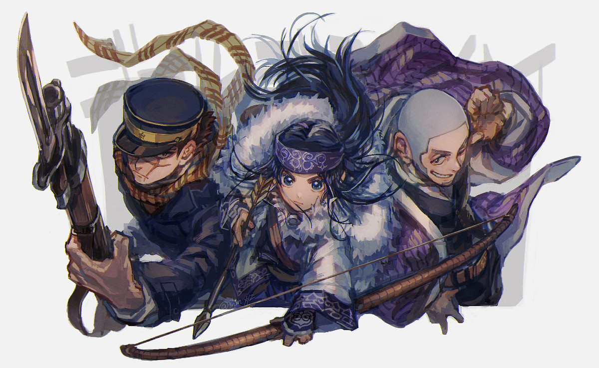 1girl 2boys ainu_clothes arisaka arrow_(projectile) asirpa bayonet belt black_eyes black_headwear black_jacket black_pants black_vest blue_eyes blue_headband bolt_action bow_(weapon) brown_belt buzz_cut cloak closed_mouth cowboy_shot facial_scar fur_cloak golden_kamuy grin gun hand_up hat headband holding holding_arrow holding_bow_(weapon) holding_gun holding_weapon jacket jhm_xyz long_hair long_sleeves looking_at_viewer military_hat military_uniform multiple_boys pants purple_jacket rifle scar scar_on_cheek scar_on_face scar_on_nose scarf shiraishi_yoshitake shirt short_hair smile standing sugimoto_saichi teeth v-shaped_eyebrows very_short_hair vest weapon white_background white_jacket white_shirt wide_sleeves yellow_scarf