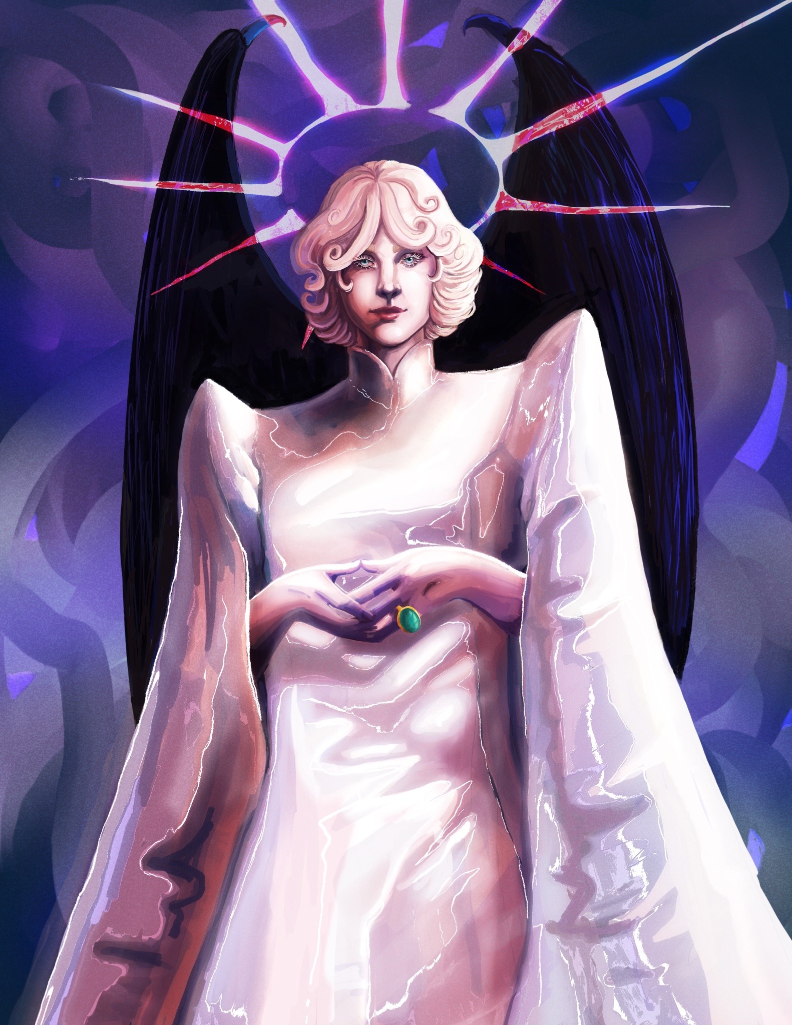 1girl blue_eyes dash-n-step demon_girl demon_wings dress expressionless halo highres long_sleeves looking_at_viewer short_hair solo spikes the_sandman_(dc) white_dress white_hair wide_sleeves wings