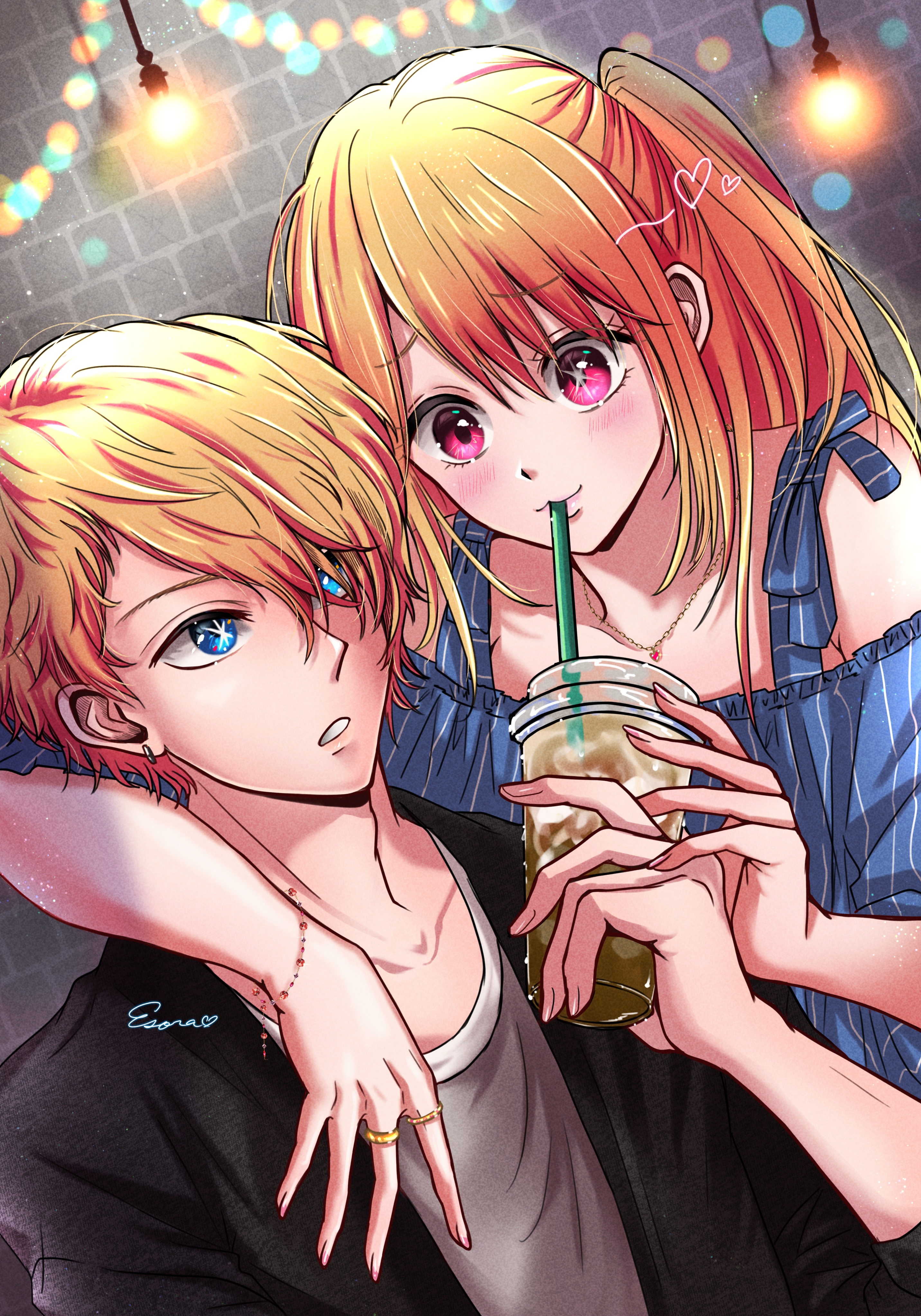 1boy 1girl :3 absurdres black_jacket blonde_hair blue_eyes blue_shirt blush bracelet brick_wall brother_and_sister collarbone commentary_request cup drinking drinking_straw drinking_straw_in_mouth dutch_angle earrings esora-arts grey_shirt hair_between_eyes heart highres holding holding_cup hoshino_aquamarine hoshino_ruby indoors jacket jewelry light_particles long_hair looking_at_another mismatched_pupils multiple_rings necklace off-shoulder_shirt off_shoulder one_side_up open_clothes open_jacket open_mouth oshi_no_ko partial_commentary pink_eyes ring shirt short_hair siblings sidelocks spoken_heart star-shaped_pupils star_(symbol) striped_clothes striped_shirt symbol-shaped_pupils twins upper_body vertical-striped_clothes vertical-striped_shirt