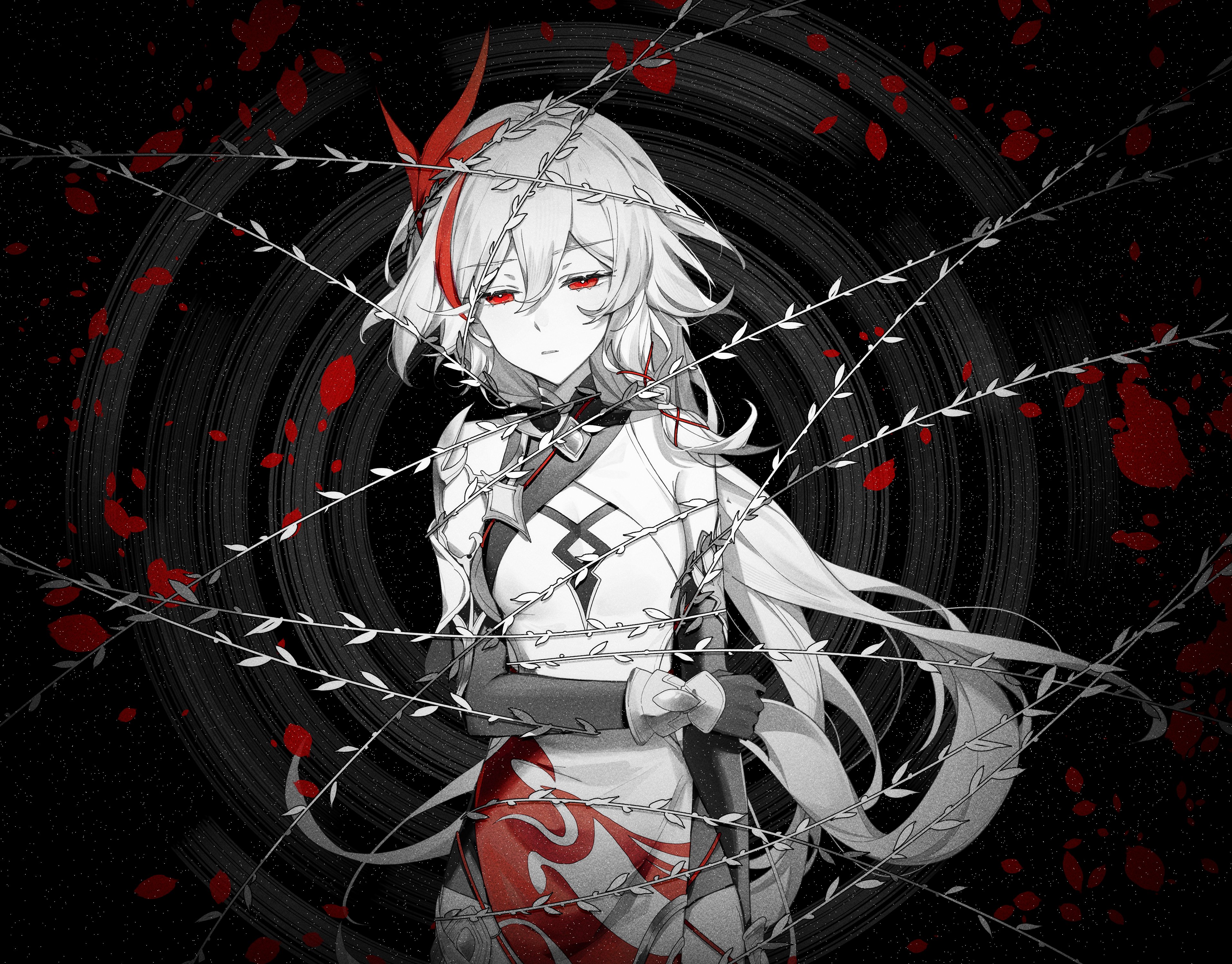 1girl :| absurdres black_background branch breasts chinese_clothes closed_mouth fu_hua fu_hua_(phoenix) gloves hair_between_eyes highres honkai_(series) honkai_impact_3rd long_hair multicolored_hair red_eyes saya_atang small_breasts solo streaked_hair upper_body