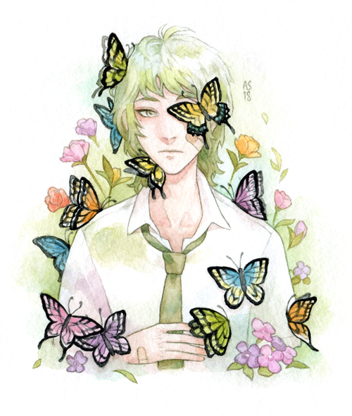 1boy bandaid bandaid_on_face bug butterfly collared_shirt driftwoodwolf expressionless flower green_eyes green_hair green_necktie insect looking_at_viewer male_focus mole mole_under_eye necktie original shirt simple_background solo upper_body