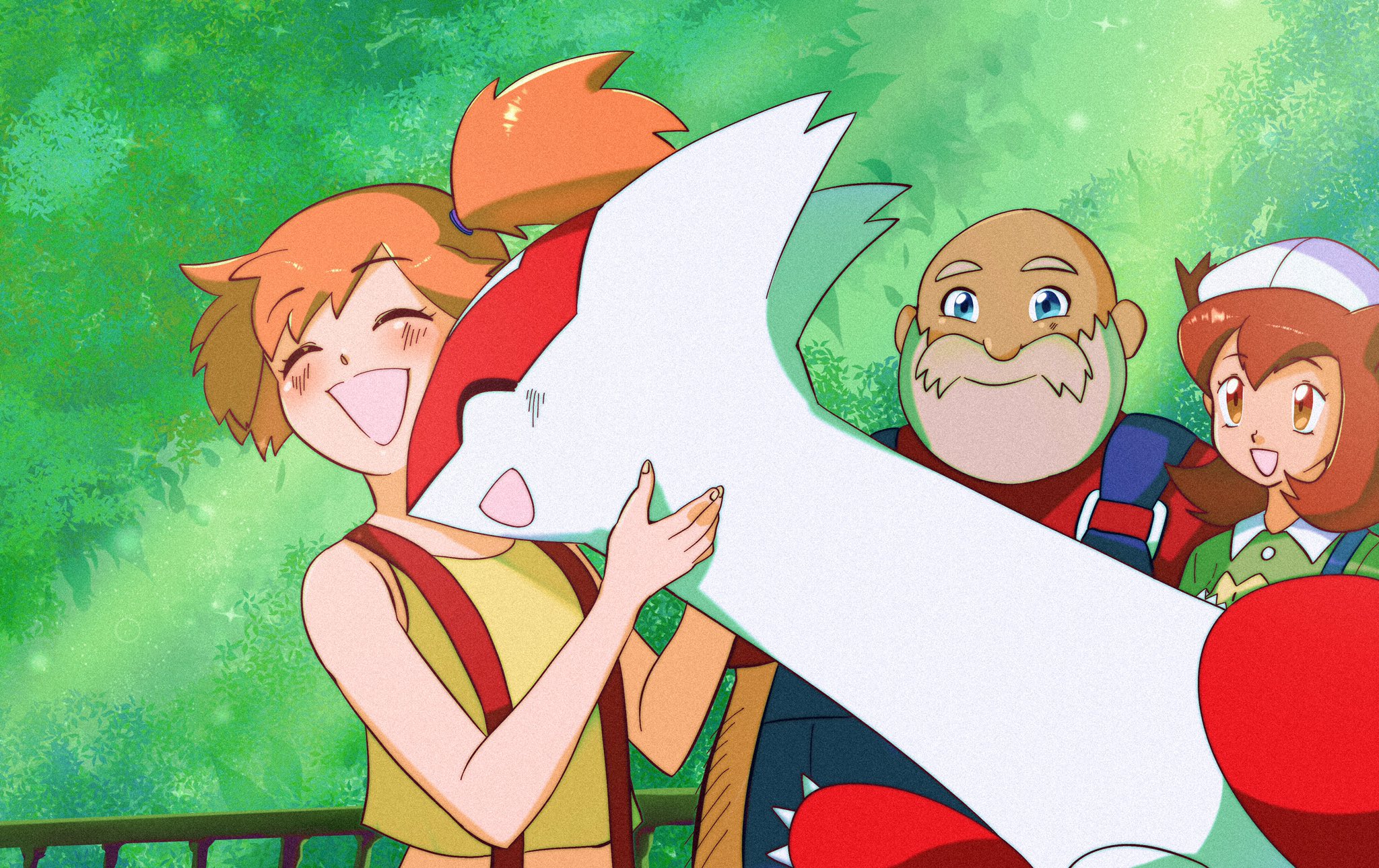 1boy 2girls asymmetrical_hair bare_shoulders bianca_(pokemon_heroes) blush closed_eyes gen_1_pokemon gen_3_pokemon gym_leader highres latias legendary_pokemon lorenzo_(pokemon) milah misty_(pokemon) multiple_girls nintendo orange_hair pokemon pokemon_(anime) pokemon_(classic_anime) pokemon_heroes:_latios_&_latias ponytail shirt short_hair side_ponytail simple_background sleeveless sleeveless_shirt smile solo_focus suspenders tank_top upper_body yellow_shirt yellow_tank_top