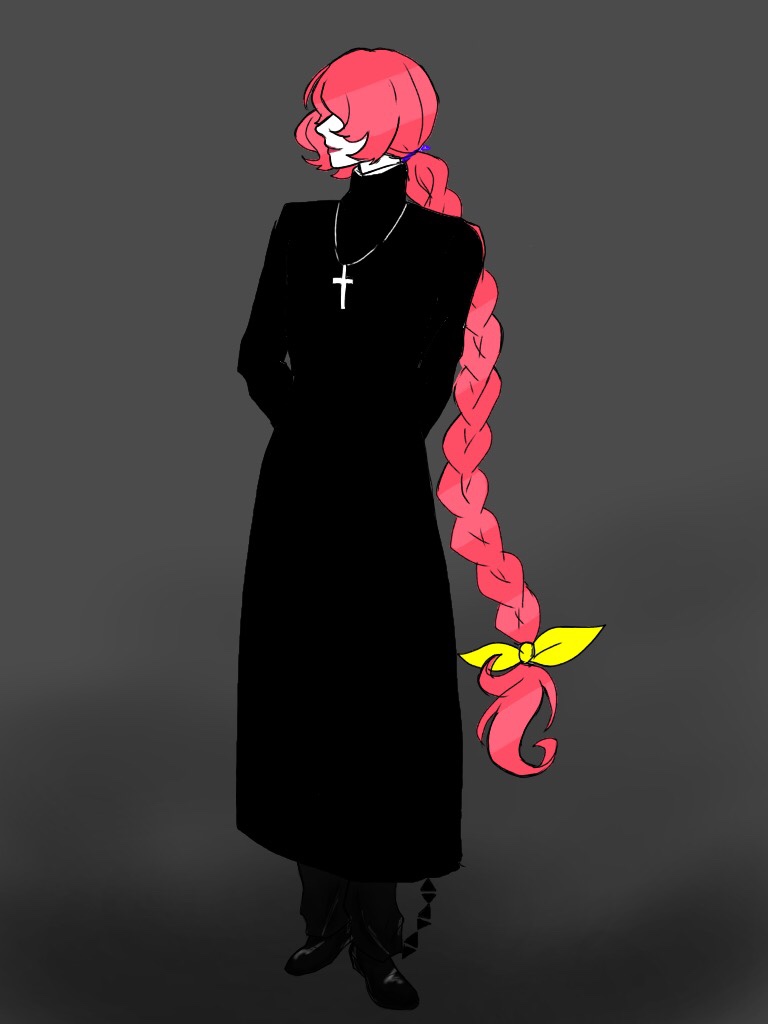 1boy 2018 alien alternate_hairstyle androgynous arms_behind_back berg_katse black_pants black_shoes bow braid braided_ponytail capricious_cat cassock collarbone commentary cross cross_necklace full_body gatchaman_crowds gradient_background hair_between_eyes hair_bow hair_tie jewelry long_hair male_focus necklace pale_skin pants pink_hair priest shoes simple_background solo standing tail very_long_hair yellow_bow